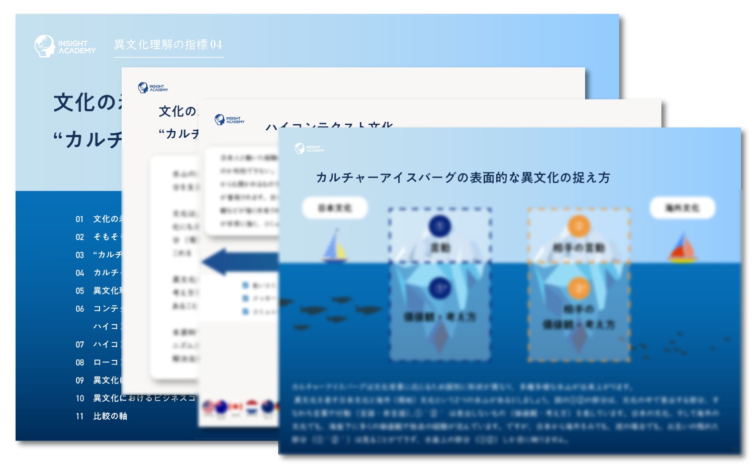 本資料では、異文化理解のメカニズムとしてカルチャーアイスバーグを活用し、異文化理解において日本人が陥りがちな問題と、それらを解決する方法をわかりやすく解説します。