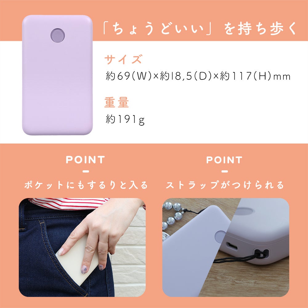 スマートフォンと重ねて持って充電したり、カバンポケットに入れて持ち運びしやすいコンパクトタイプ。