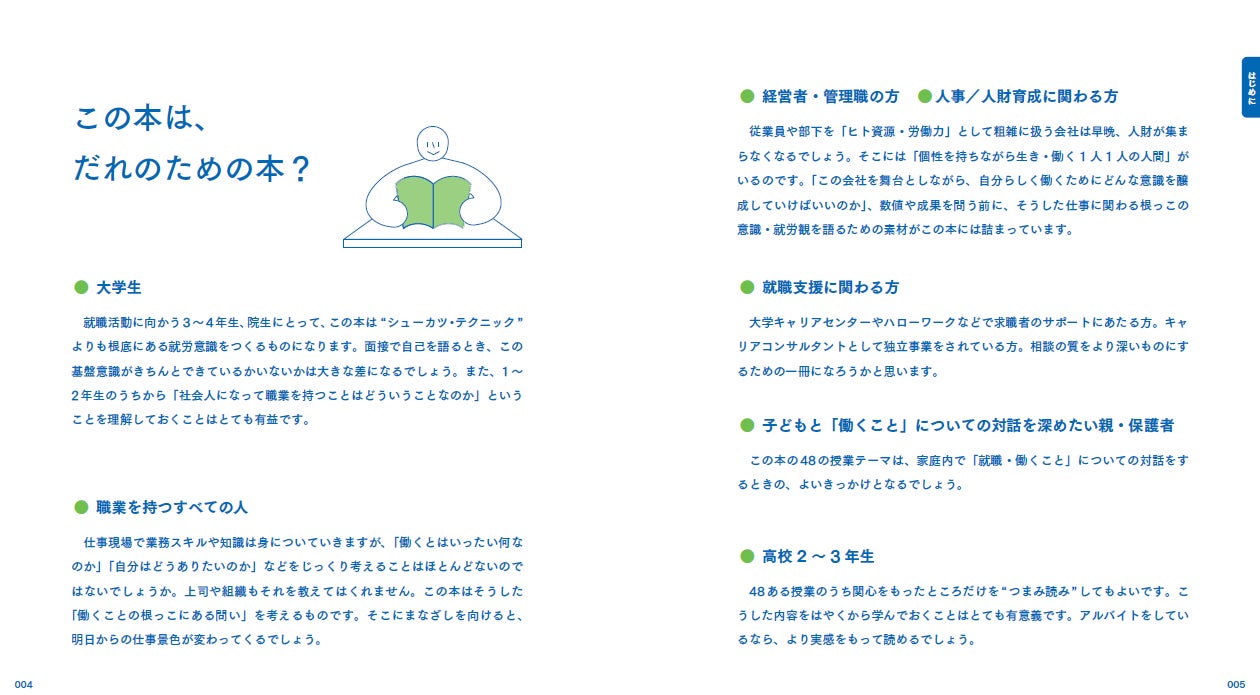 主に大学生・若いビジネスパーソンに向けて書かれていますが、普遍的・根本的な内容を扱っているため、職業を持つすべての人に役立つ書籍です。