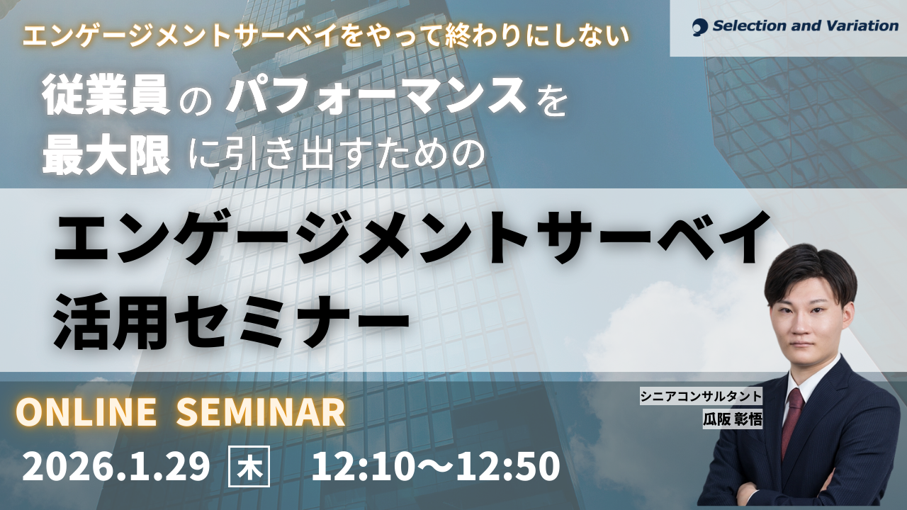 組織・人事コンサルティングファームであるセレクションアンドバリエーション株式会社(以下、当社、東京都千代田区丸の内、大阪市西区、名古屋市西区 / 代表取締役社長:平康慶浩/ URL:https://sele-vari.co.jp/ )は『エンゲージメントサーベイをやって終わりにしない -従業員のパフォーマンスを最大限に引き出すためのエンゲージメントサーベイ活用セミナー-』セミナーを2026年1月29日(木)12:10〜12:50に開催することをお知らせいたします。