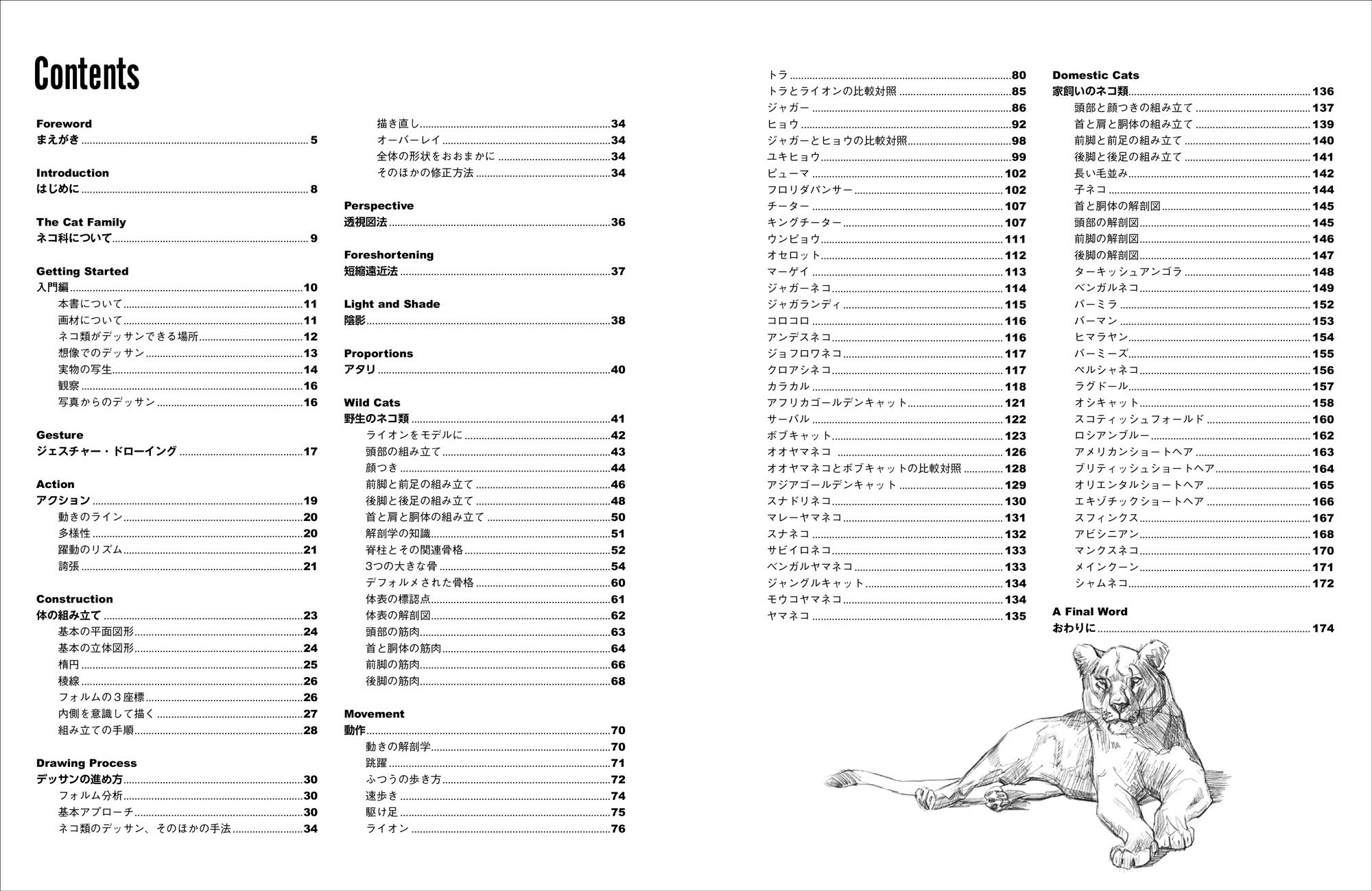 まえがき/はじめに/ネコ科について/入門編/ジェスチャー・ドローイング/アクション/体の組み立て/デッサンの進め方/透視図法/短縮遠近法/陰影/アタリ/野生のネコ類/動作/家飼いのネコ類/おわりに