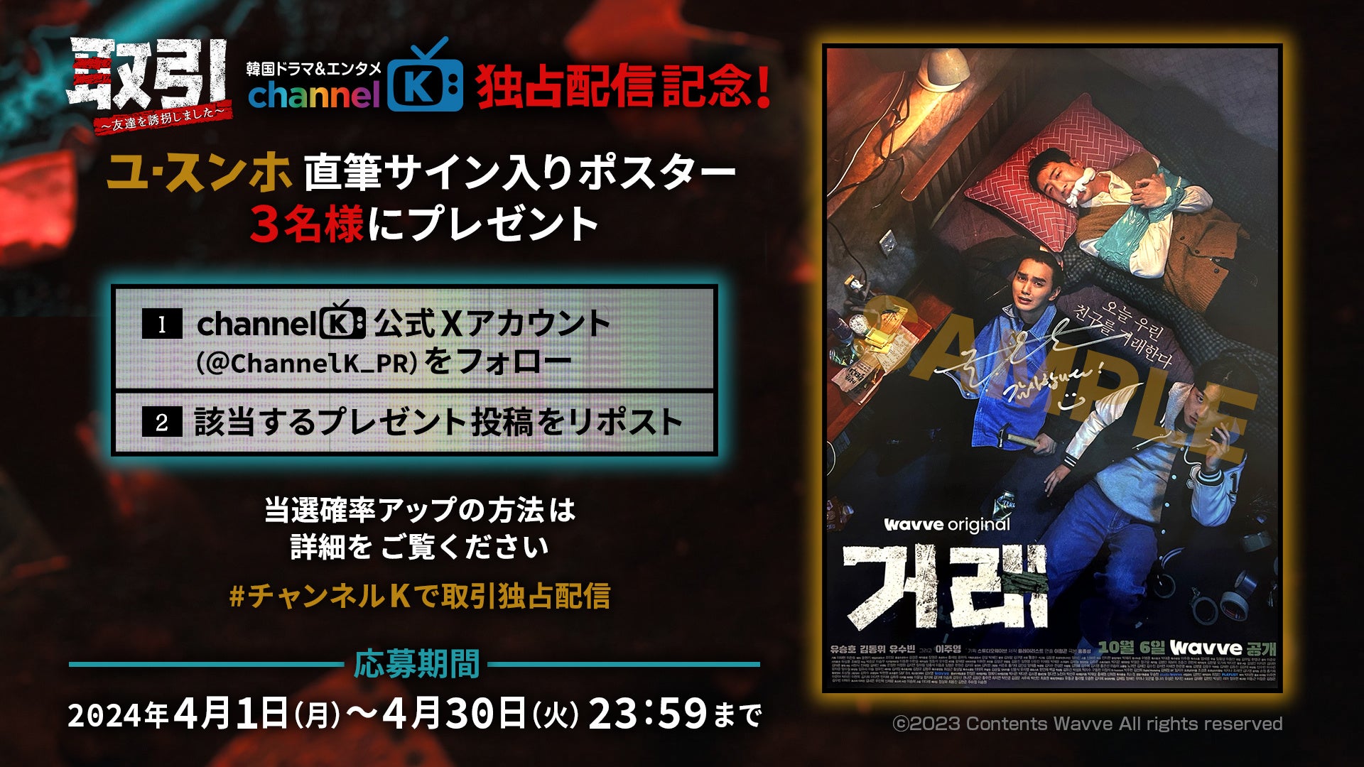 さらに!チャンネルKでは「取引~友達を誘拐しました~」の独占配信を記念して、主演ユ・スンホの直筆サイン入りポスターが抽選で3名様に当たるプレゼントキャンペーンを実施中!