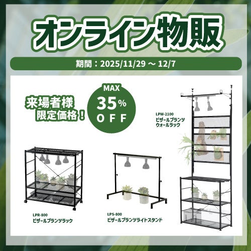 当日は、園芸用品コーナー「ユーコンシェルジュ(南榮工業)」ブース(E-7)内にて、【ビビプランツ】の人気製品「ビザールプランツラック」シリーズを展示。これまでオンラインでしかチェックできなかった植物棚を、見て、触れて、サイズ感や質感などの細部まで確認することができます。実際に育成ライトや鉢を並べた状態でのレイアウトをチェックして、インスピレーションを感じていただける絶好の機会です。