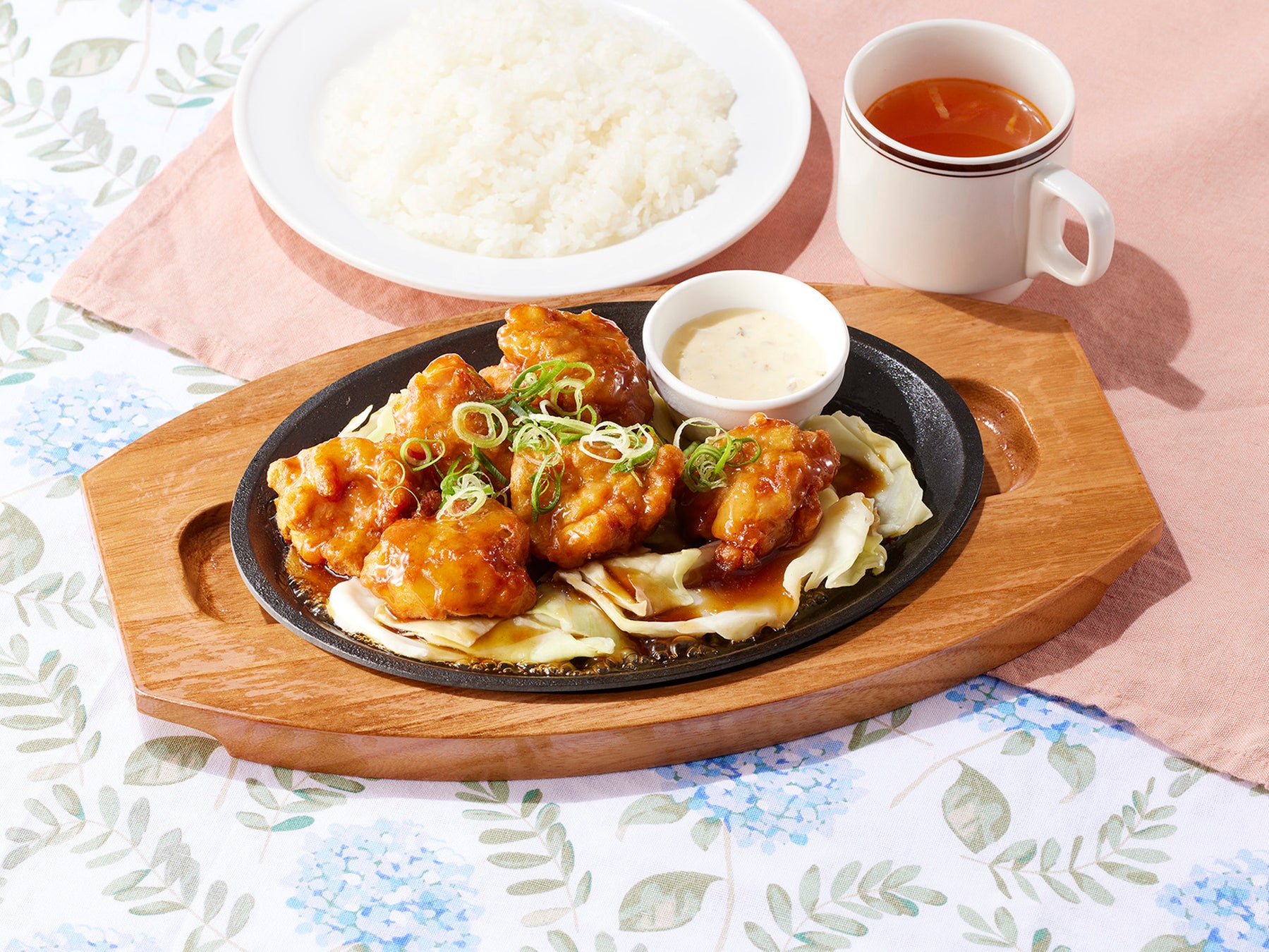 焼くことで甘みを増したシャキシャキのキャベツとジューシーなチキン6個を鉄板にのせ、甘酢がベースのソースをたっぷりかけた食べ応え抜群の一品です。甘辛い風味のソースが食欲をそそり、ライスを食べる手が止まりません!お好みで、別添えの濃厚タルタルソースをたっぷり付けてお召し上がりください。