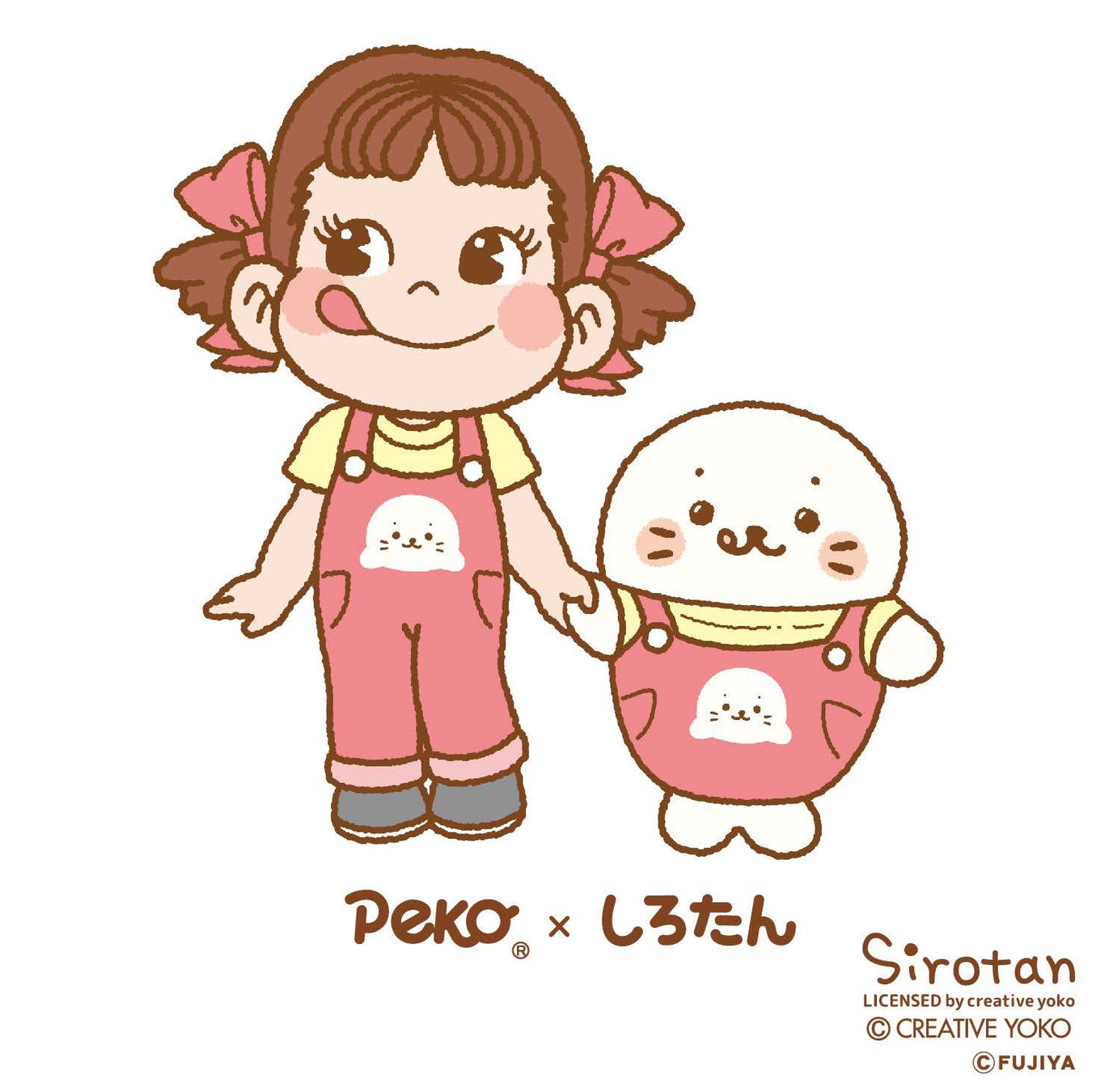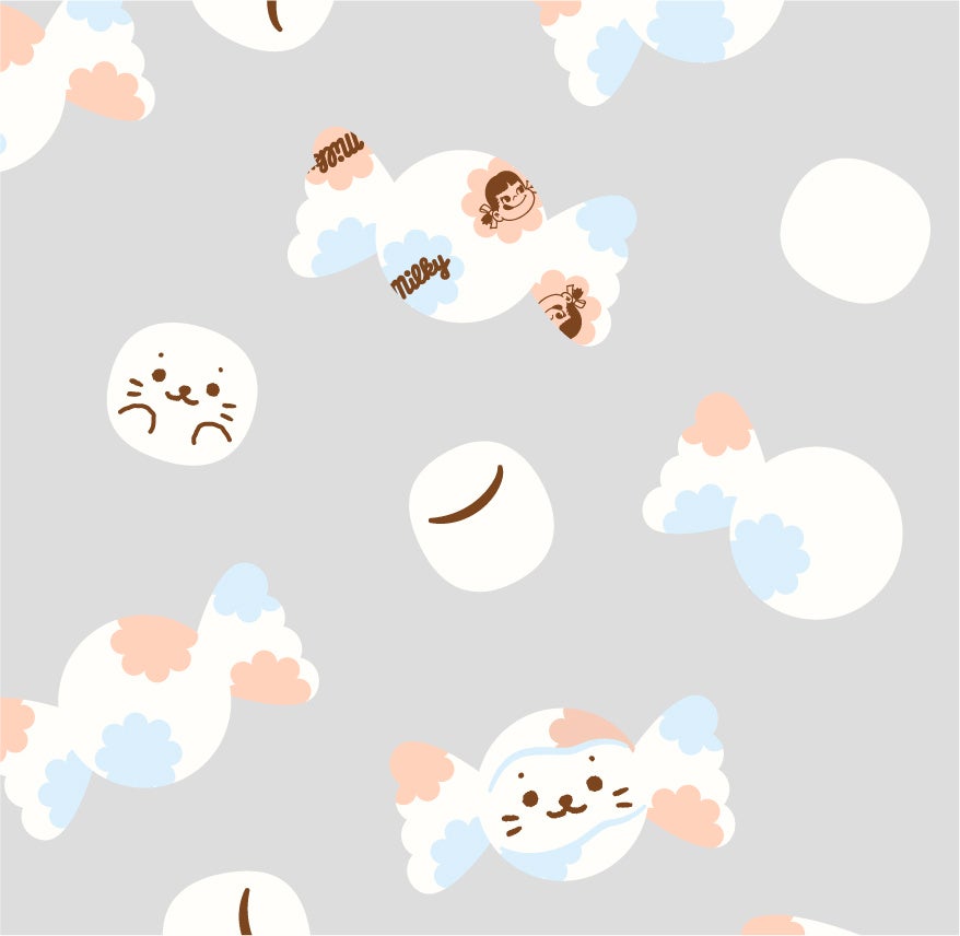 しろくてまるいフォルムがかわいいしろたんは、不二家のロングセラー「ミルキー」にそっくり?! そんな共通点を見つけたしろたんが、ペコちゃんとお友だちになり、お揃いのオーバーオールを着たり、舌をペロリと出した表情をまねっこしてみたりと、かわいくて楽しいコラボが実現しました。ミルキーの包み紙にこっそり隠れるしろたんは必見! 遊び心満載のコラボデザインにぜひご注目ください。