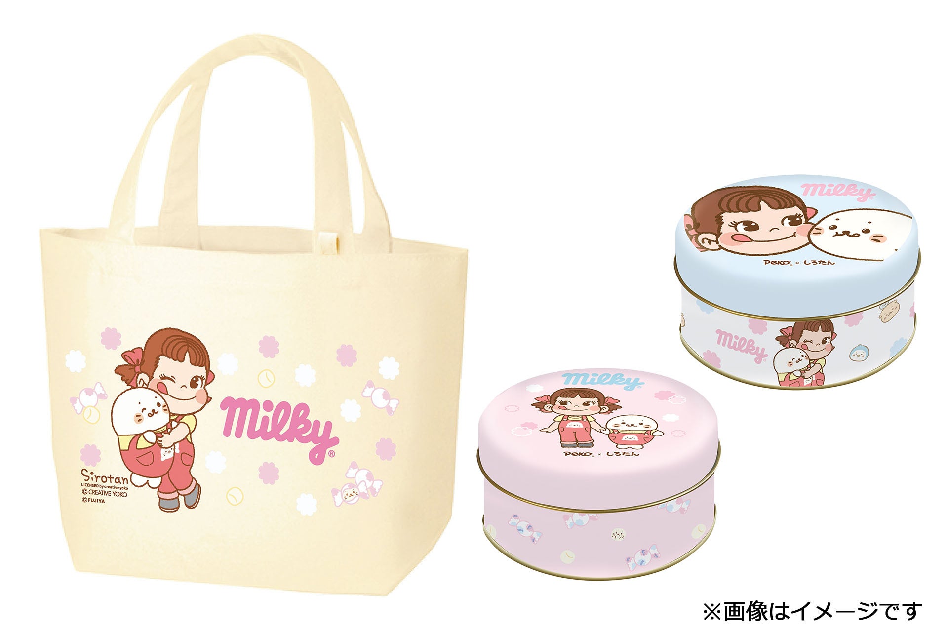 不二家洋菓子店ネット予約受付サイト「FUJIYA-Sweets.com」では「ランチトート(ペコちゃん×しろたん)」と「ミルキー缶(ペコちゃん×しろたん)」のセット商品も販売いたします。