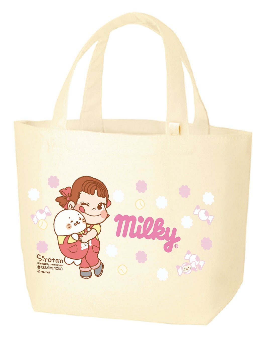 ぺコちゃんとしろたんがハグをしているイラストにミルキーロゴとミルキーフラワー、ミルキーの包み紙や包み紙に隠れているしろたんをデザインしたキュートなトートバッグです。