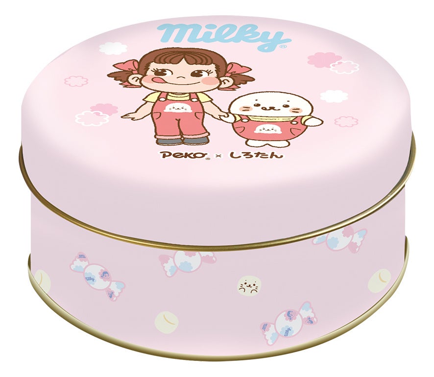 ペコちゃんとしろたんのイラストが入ったデザイン缶にミルキーが19粒入ったミルキー缶が登場。
