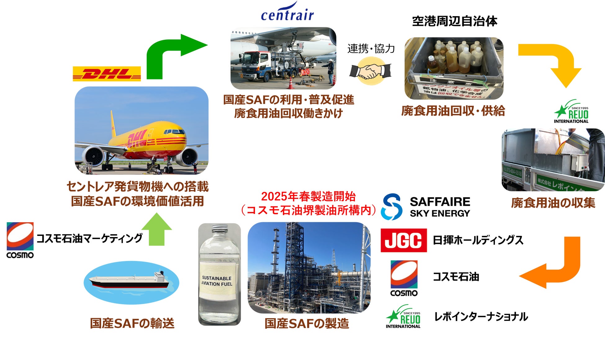 コスモ石油マーケティングとDHL Expressは、2025年1月28日付でSAF売買契約を締結しました※1。DHL Express向けに供給するSAFは、2021年にNEDO(国立研究開発法人 新エネルギー・産業技術総合開発機構)の「国産廃食用油を原料とするSAF製造サプライチェーンモデルの構築」助成事業として採択され※2取り組んできたものであり、国内で初めて大規模生産される国産SAFです。持続可能な製品の国際的な認証制度「ISCC CORSIA認証」「ISCC EU認証」を取得しており※3、環境価値が証明されています。コスモ石油、日揮ホールディングス株式会社(代表取締役会長兼社長CEO:佐藤 雅之)、株式会社レボインターナショナル(代表取締役CEO:越川 哲也)の3社により設立された合同会社SAFFAIRE SKY ENERGY(代表者:髙田 岳志)が製造し、2025年度よりコスモエネルギーグループを通じて航空各社に供給します。