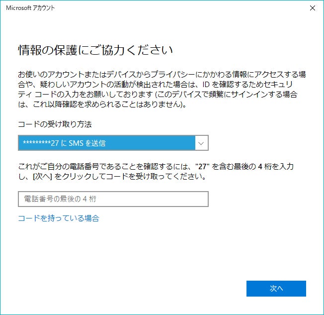 Step4:Microsoftアカウントで認証済みの電話番号を入力し、パスワード変更に必要なコードを発行します。