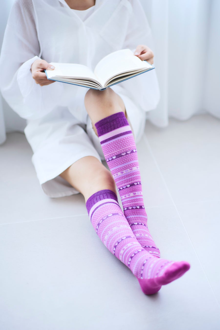 ハートのラインやストライプなどの組み合わせが表情豊かなストライプ柄の着圧ソックスです。