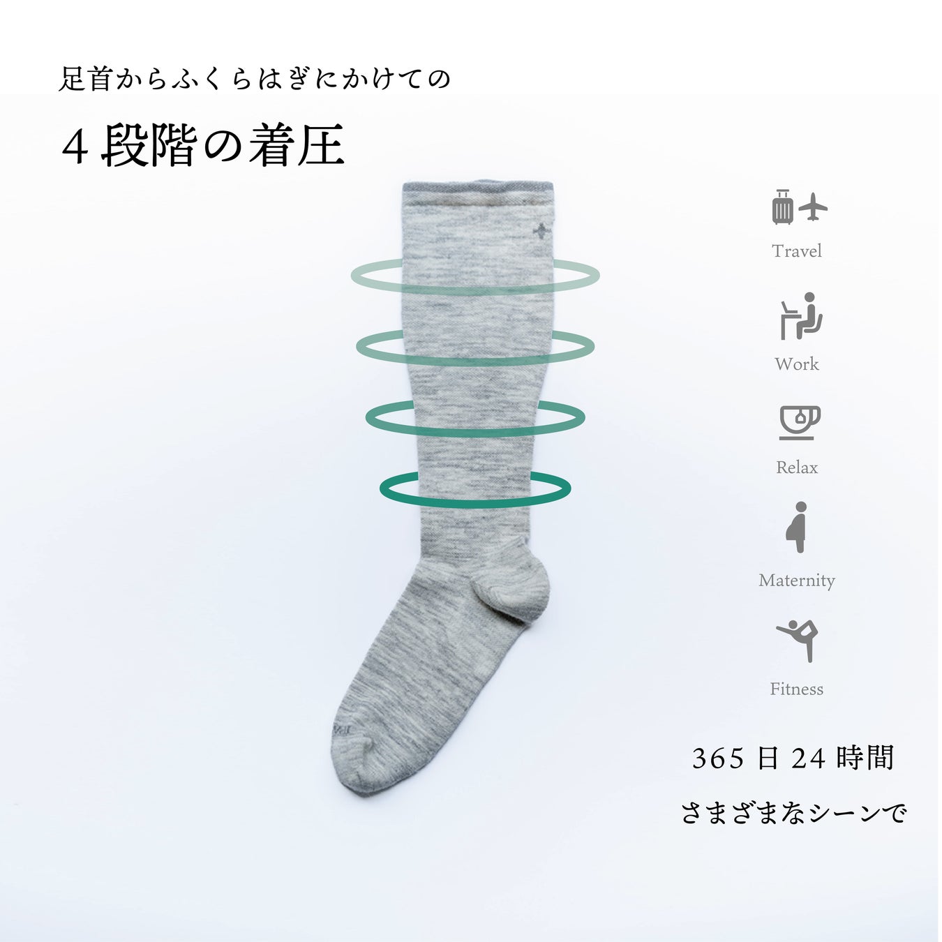足首からふくらはぎにかけての段階的着圧、シームレスなつま先、締め付けない履き口で、朝履いた時から夜脱ぐ時まで着圧による窮屈さを感じさせません。