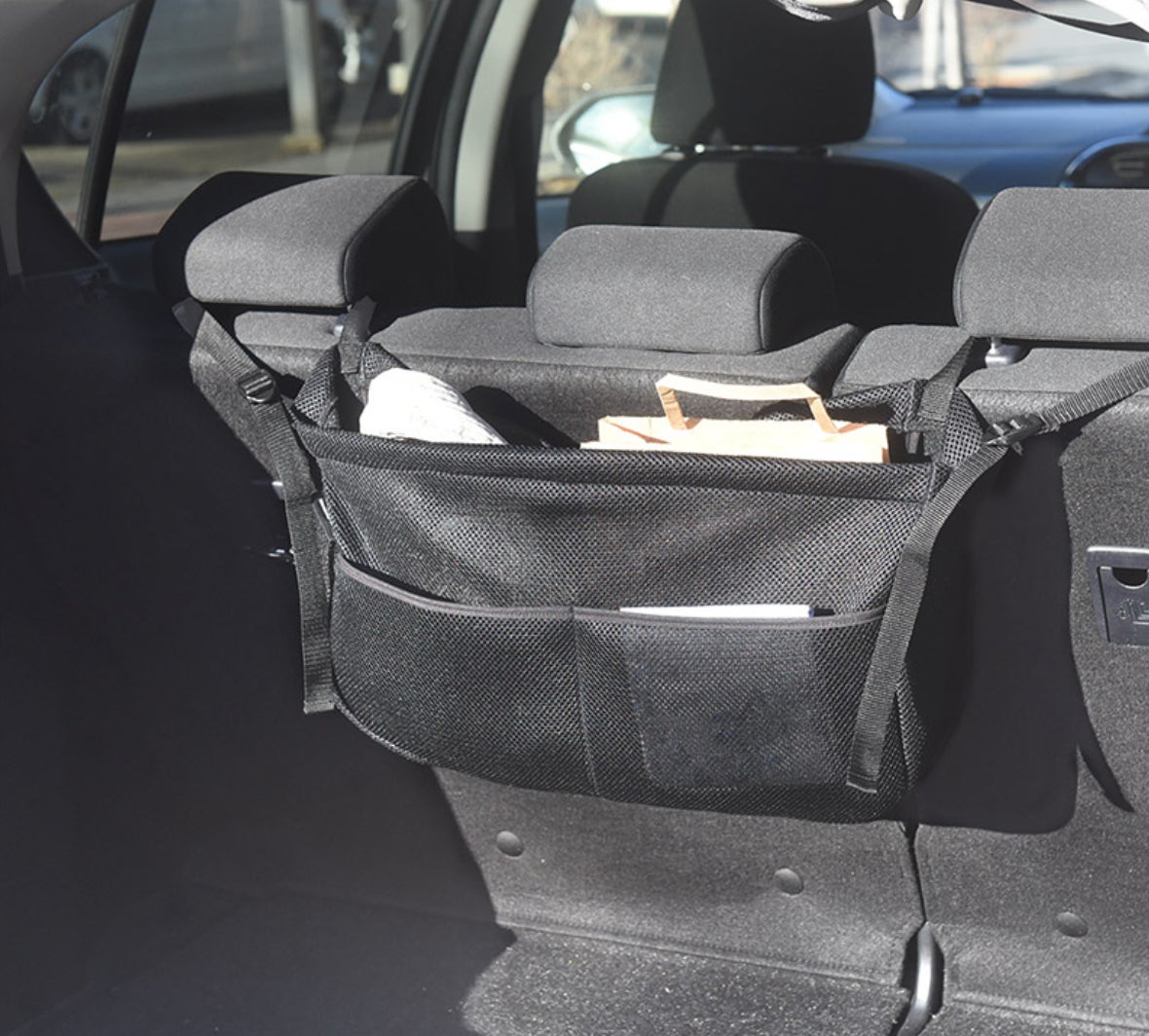 ヘッドレストに取り付けるので、運転席からも荷物を出し入れしやすさ◎。