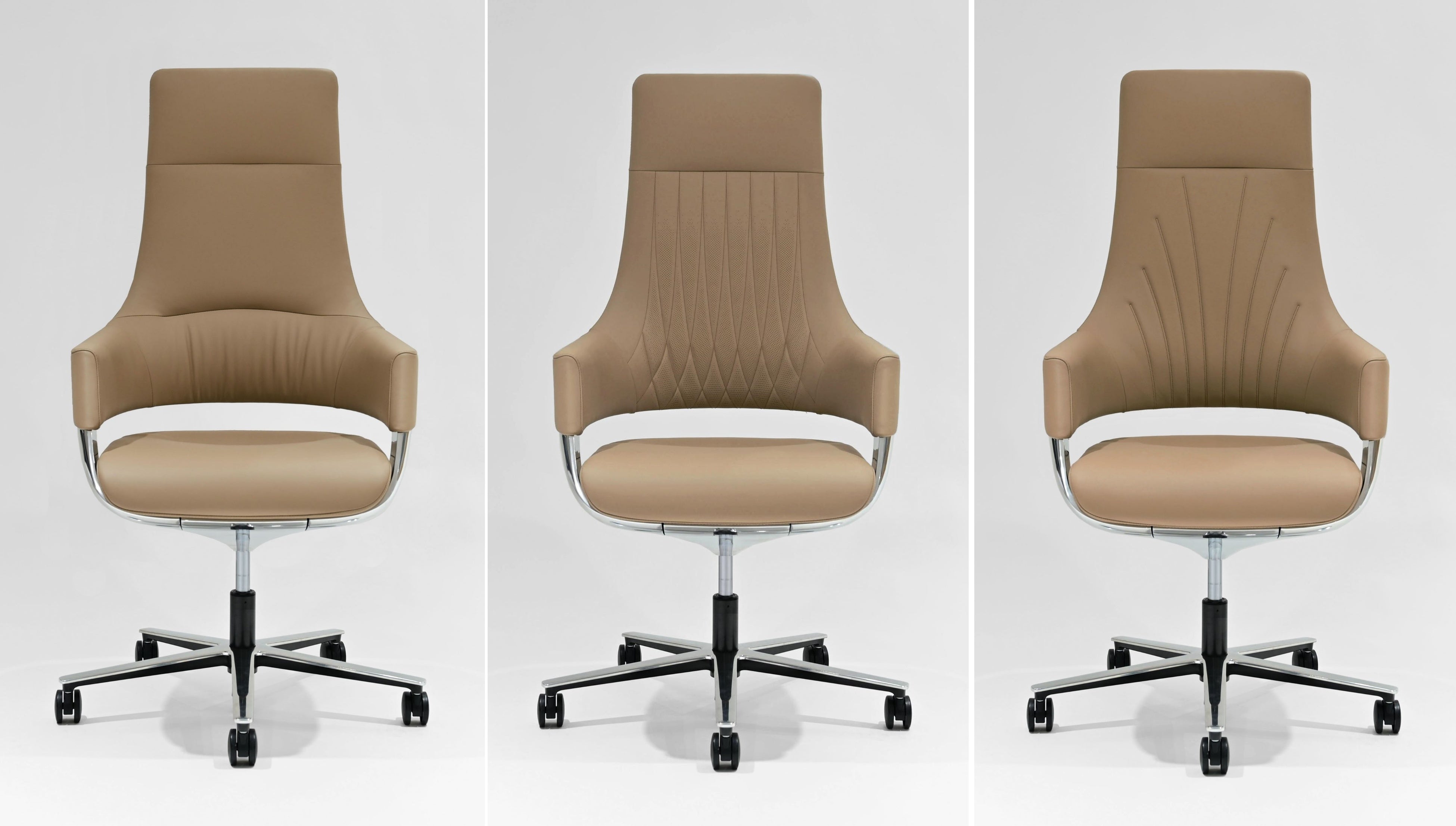 「Flotte ラグジュアリータイプ」は、オカムラが長年のチェア製造で培った張りの技術を生かし、「Flotte」の背もたれ部分の本革に加工を施すことで、上質感を引き立てるデザインにこだわりました。高度な張りの技術により実現したドレープデザイン1種と、本革に縫製を施したキルティングデザイン2種の計3種類です。シンプルなシルエットに上質感を加え、エグゼクティブな空間に調和します。