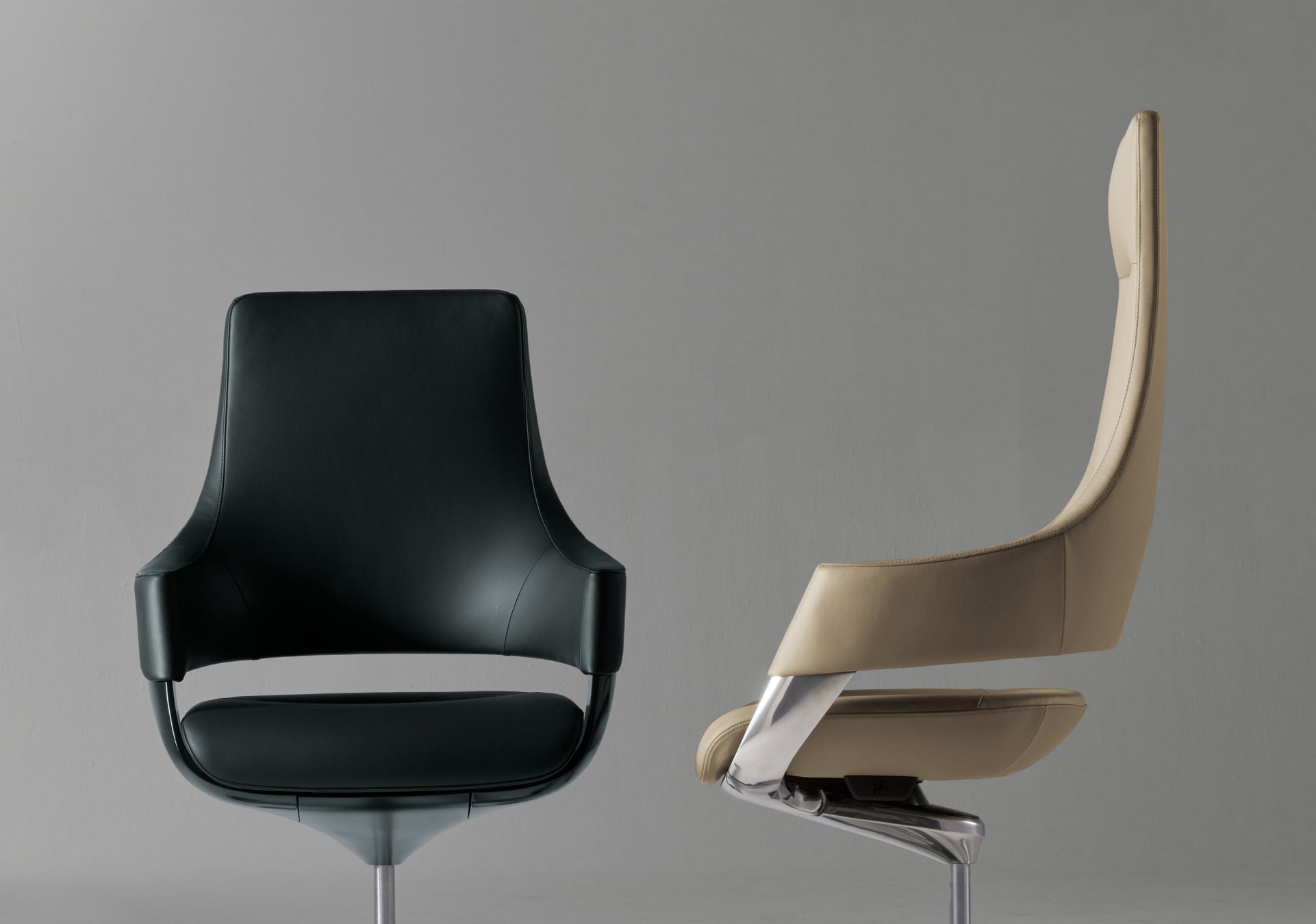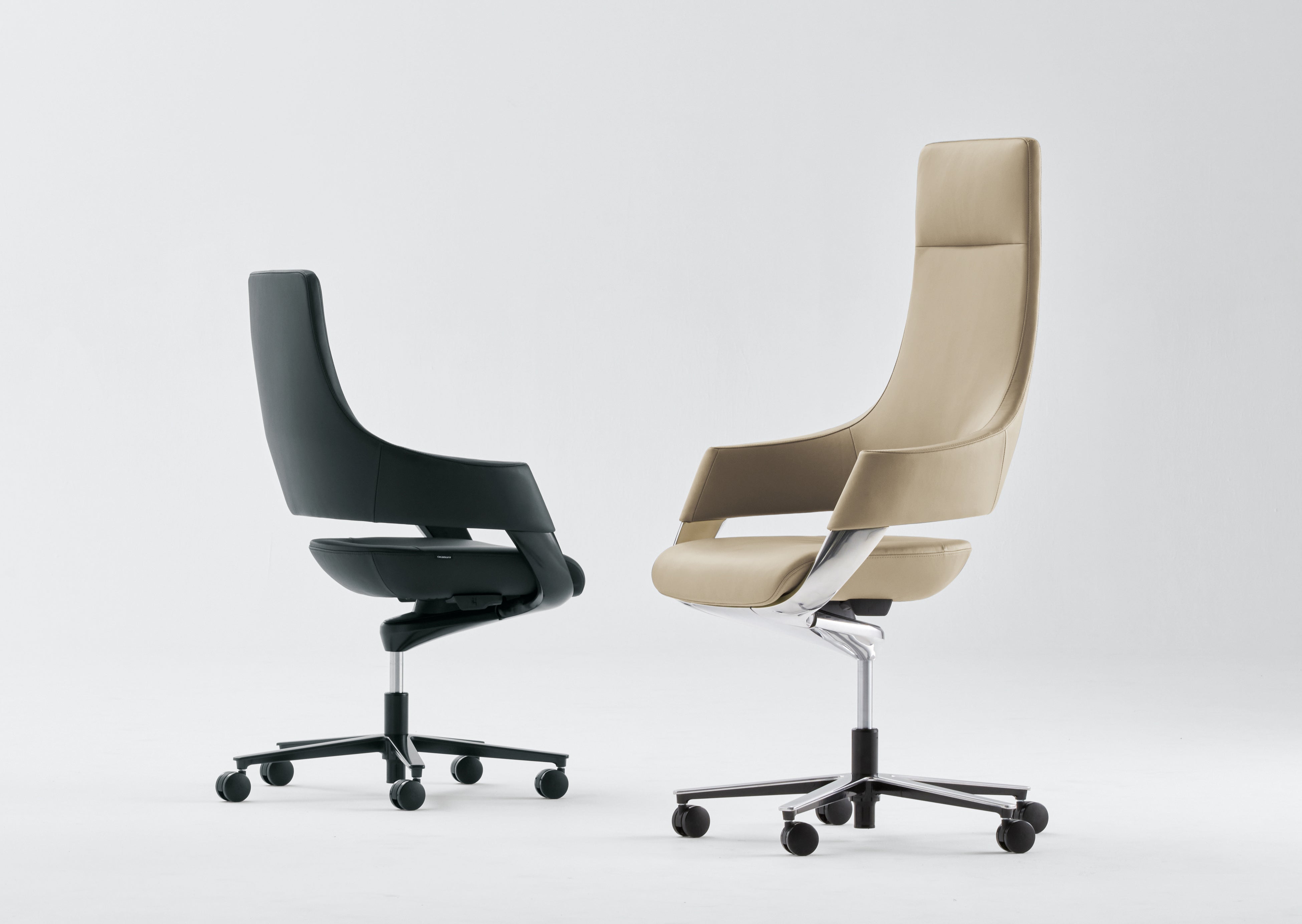 「Flotte」は、シンプルで無駄のない造形と、背もたれと座面の間に抜けのあるデザインで、軽やかさと気品を感じさせるカンファレンスシーティングです。張材に本革を使用し、リクライニングや高さ調整などの機能も兼ね備えました。