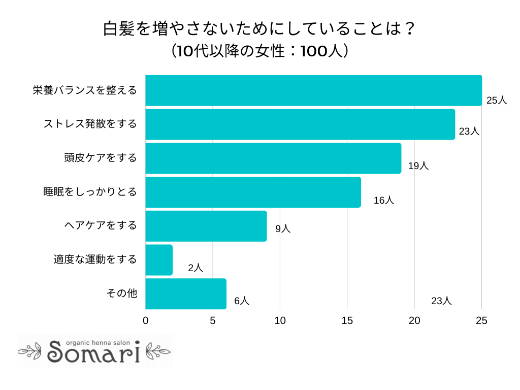株式会社AWA(https://a-w-a.co.jp/)が運営する地域密着型白髪染め専門美容室ソマリ(https://a-w-a.co.jp/hennasalonsomari/)は、日本全国の10代以上の女性を対象に「白髪を増やさないためにしていることは?」とアンケート調査を実施しました。