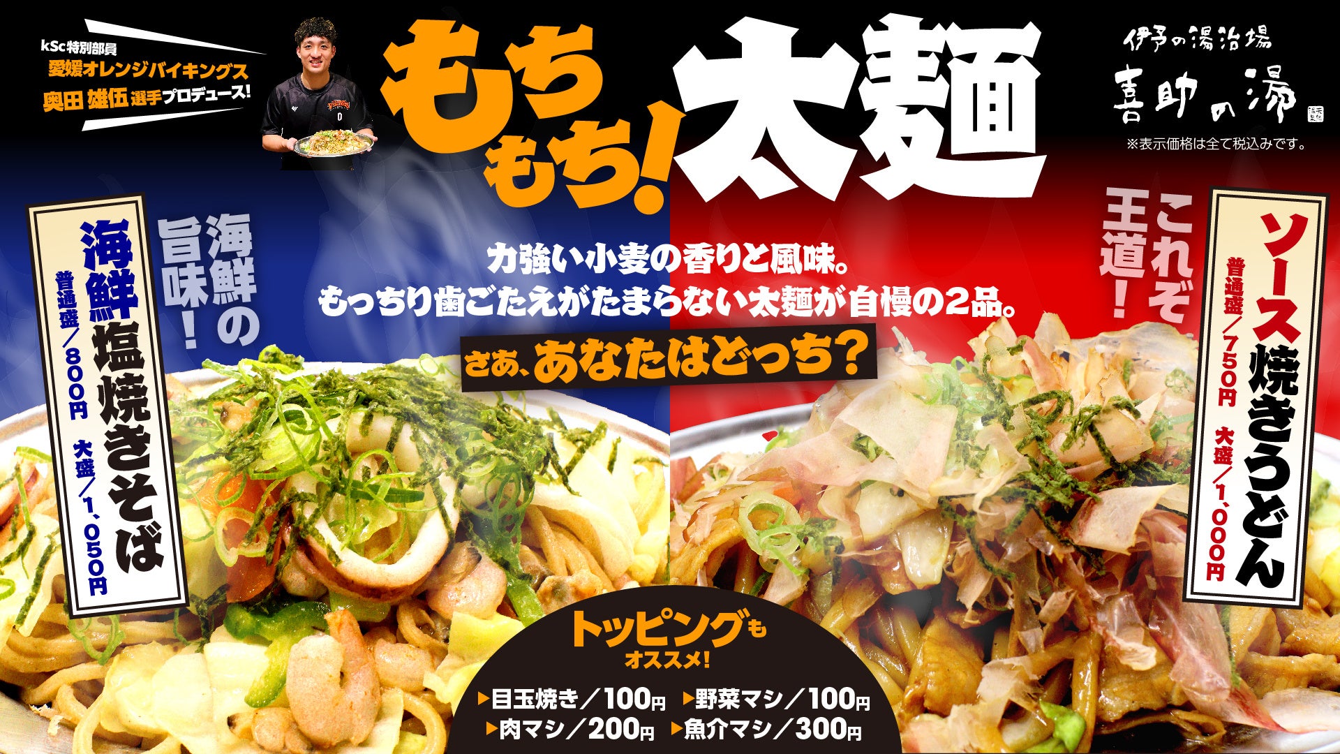 Vsサ飯シリーズ第2弾【愛媛オレンジバイキングス 奥田雄伍選手プロデュース】もちもち太麺対決!「海鮮塩焼きそば」と「ソース焼きうどん」新登場!-喜助の湯にて限定販売-