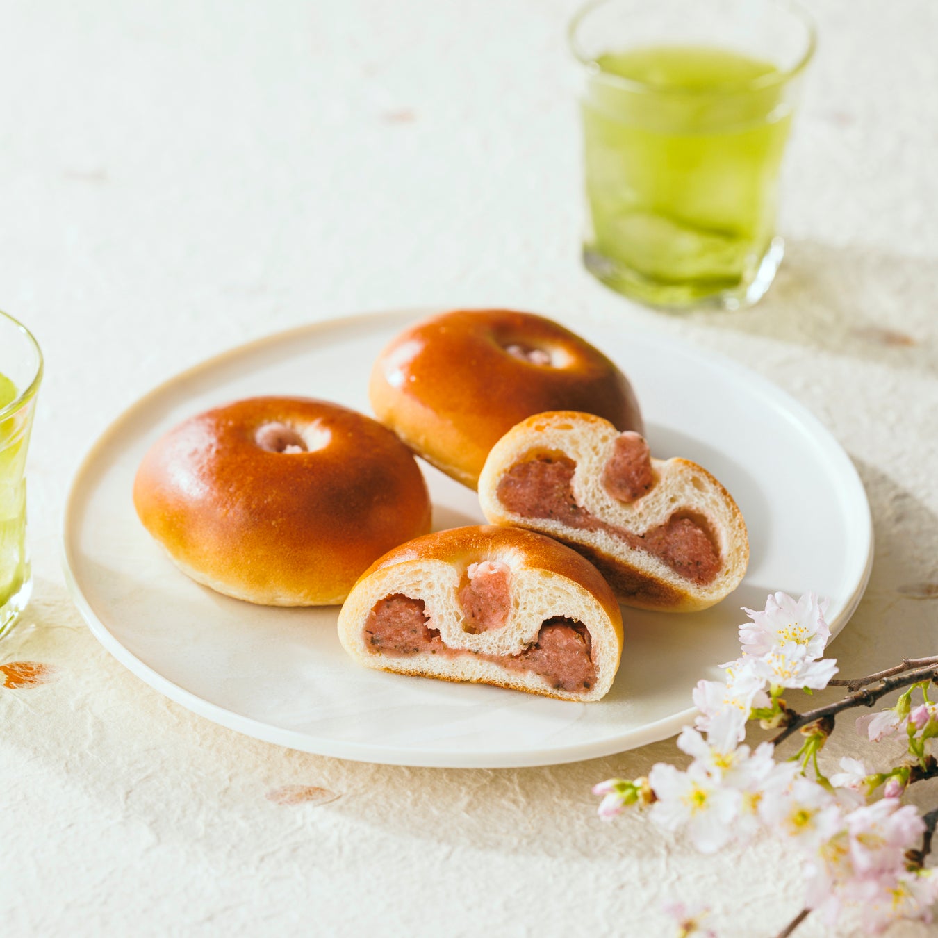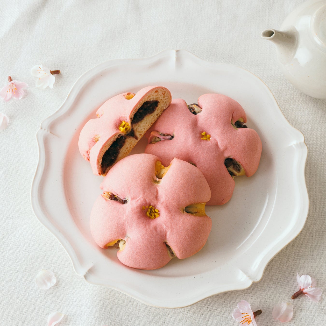 桜もちフィリングとつぶ餡を包み、ピンク色の桜風味のビスケット生地をのせて花の形に焼き上げました。かわいらしい見た目と桜の味わいを最後まで楽しめる桜パンです。