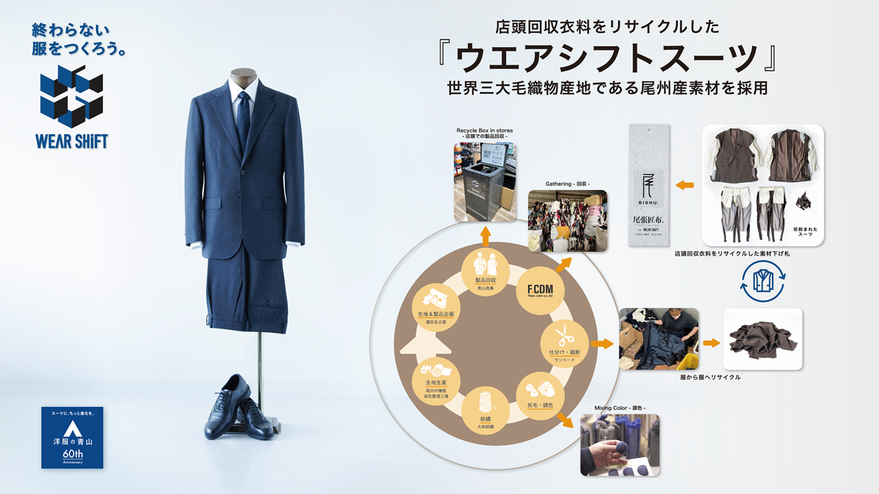 青山商事株式会社(本社:広島県福山市/代表取締役社長:青山理(おさむ))は、洋服の青山の店舗などに設置している『リサイクリングボックス』から回収したスーツのウールを取り入れた循環型スーツ『ウエアシフトスーツ』を、11月12日(火)から「洋服の青山」全店および、公式オンラインストアで発売します。