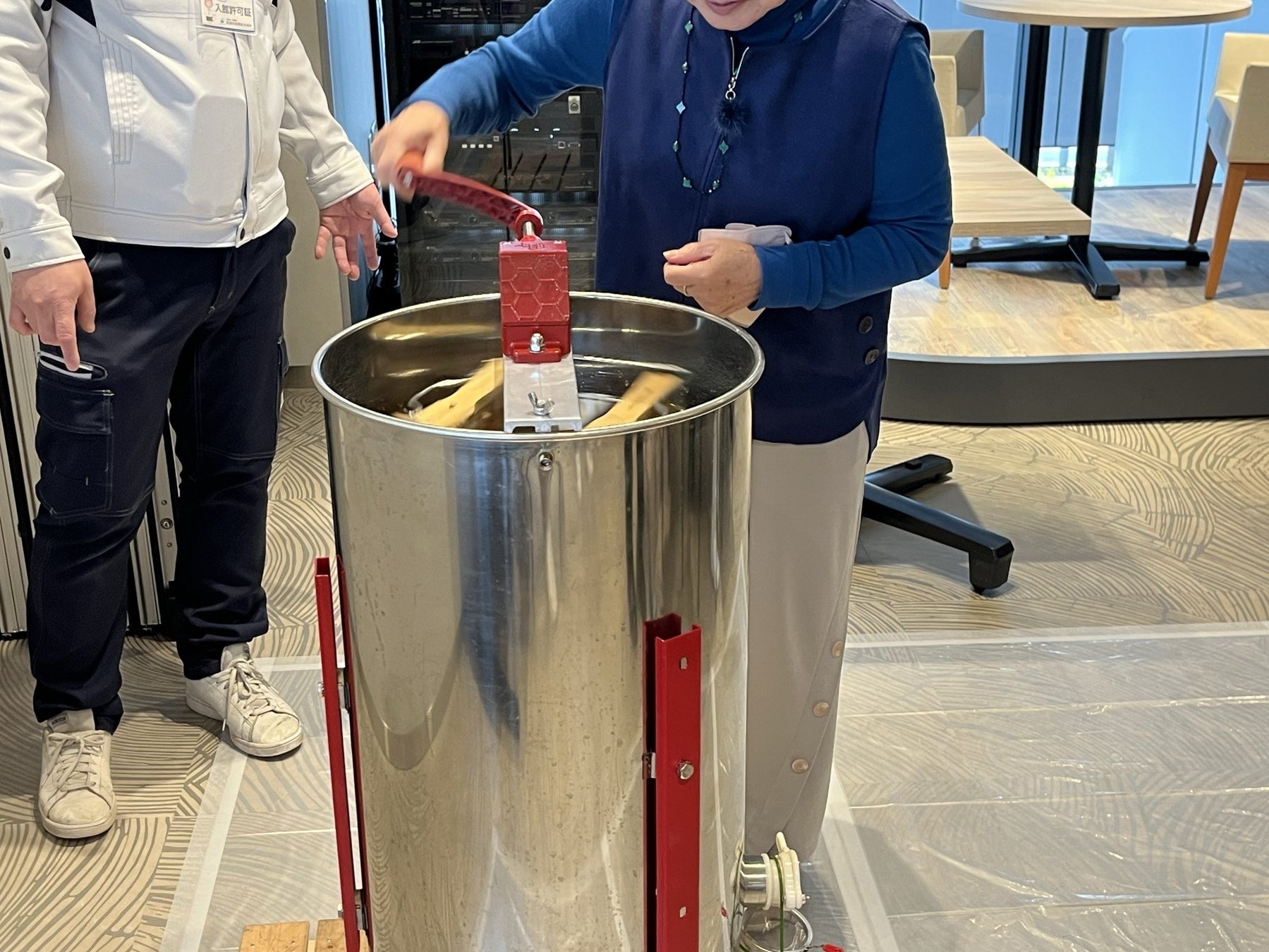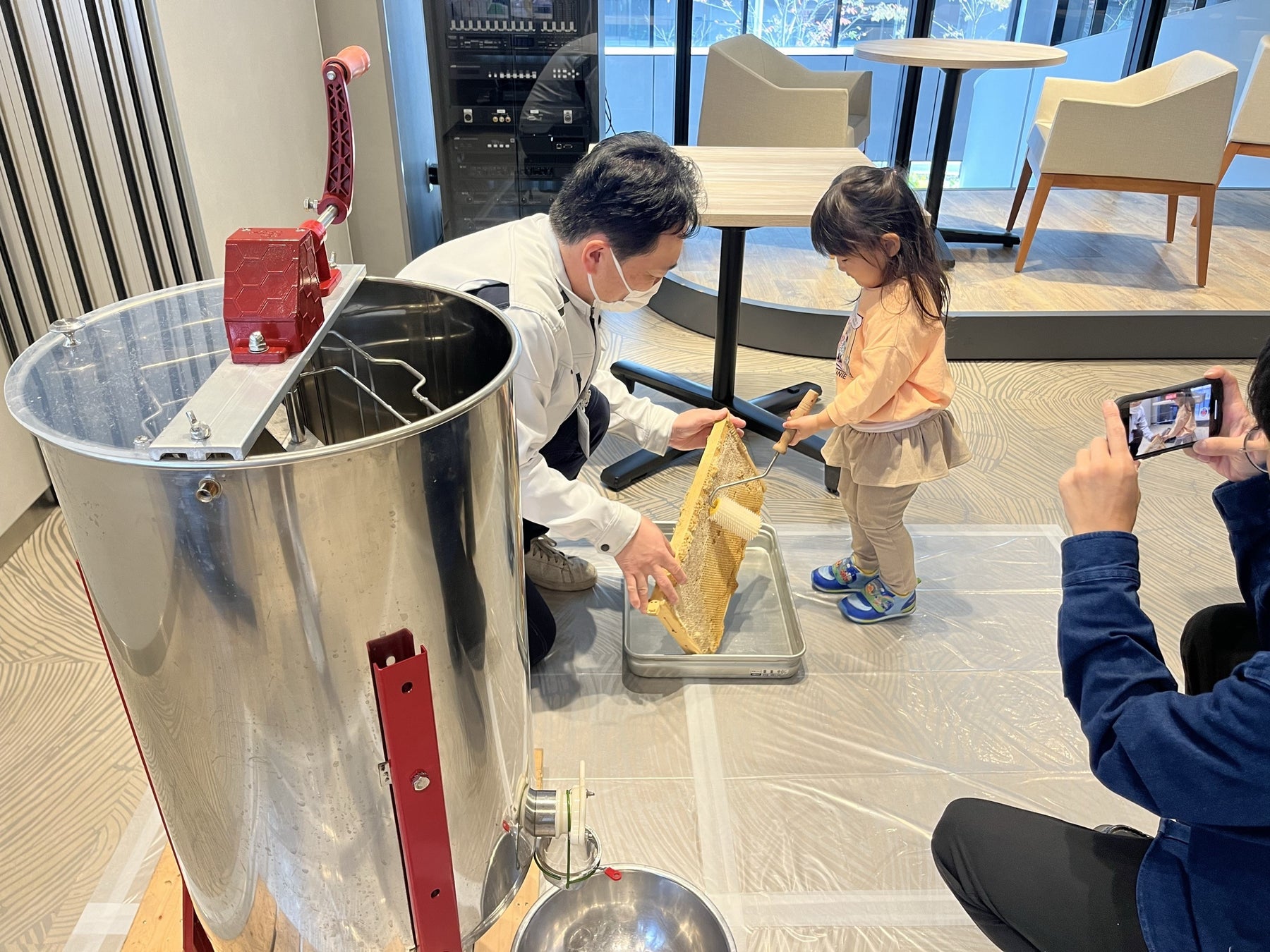 参加者は普段は立ち入ることのできない病院の屋上養蜂場を見学し、巣箱を間近で観察しました。また、採蜜体験を通じて、搾りたてのハチミツを使用したオリジナルのハニーナッツ作りを楽しみました。お孫さんとおじいちゃんなどファミリー層を中心に、幅広い世代が参加し、ハチミツの魅力を実感する素晴らしい一日となりました。