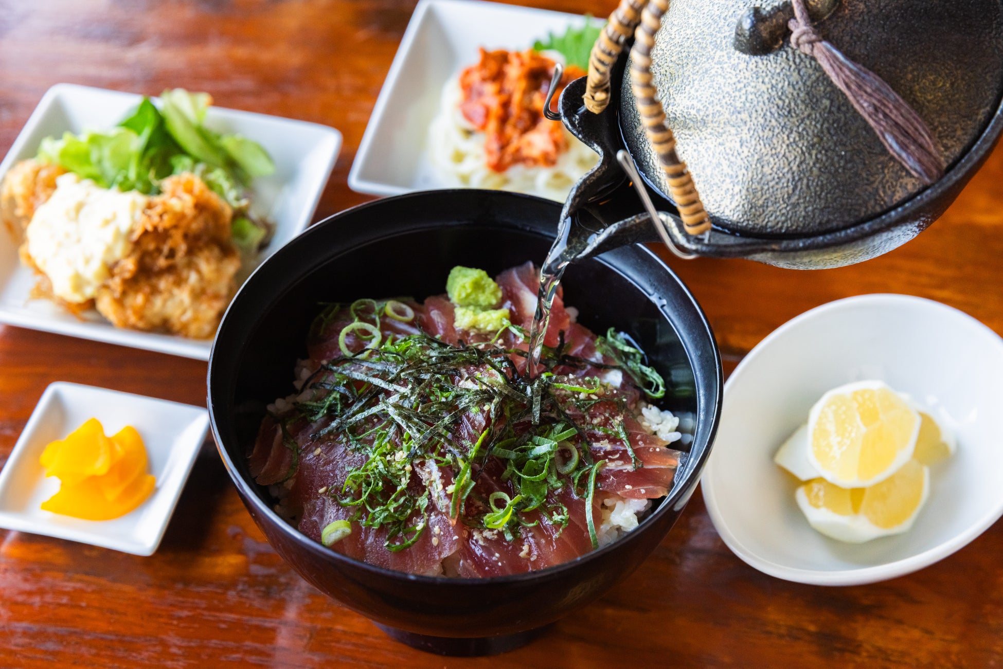 日南沖で水揚げされたかつおはそのままでも、出汁茶漬けとしてもお楽しみいただける一品です。そのほか、宮崎名物のチキン南蛮や日南名物の魚うどんなどを盛り込み、ご当地の味覚を気軽に楽しめる和食会席に仕上げています。