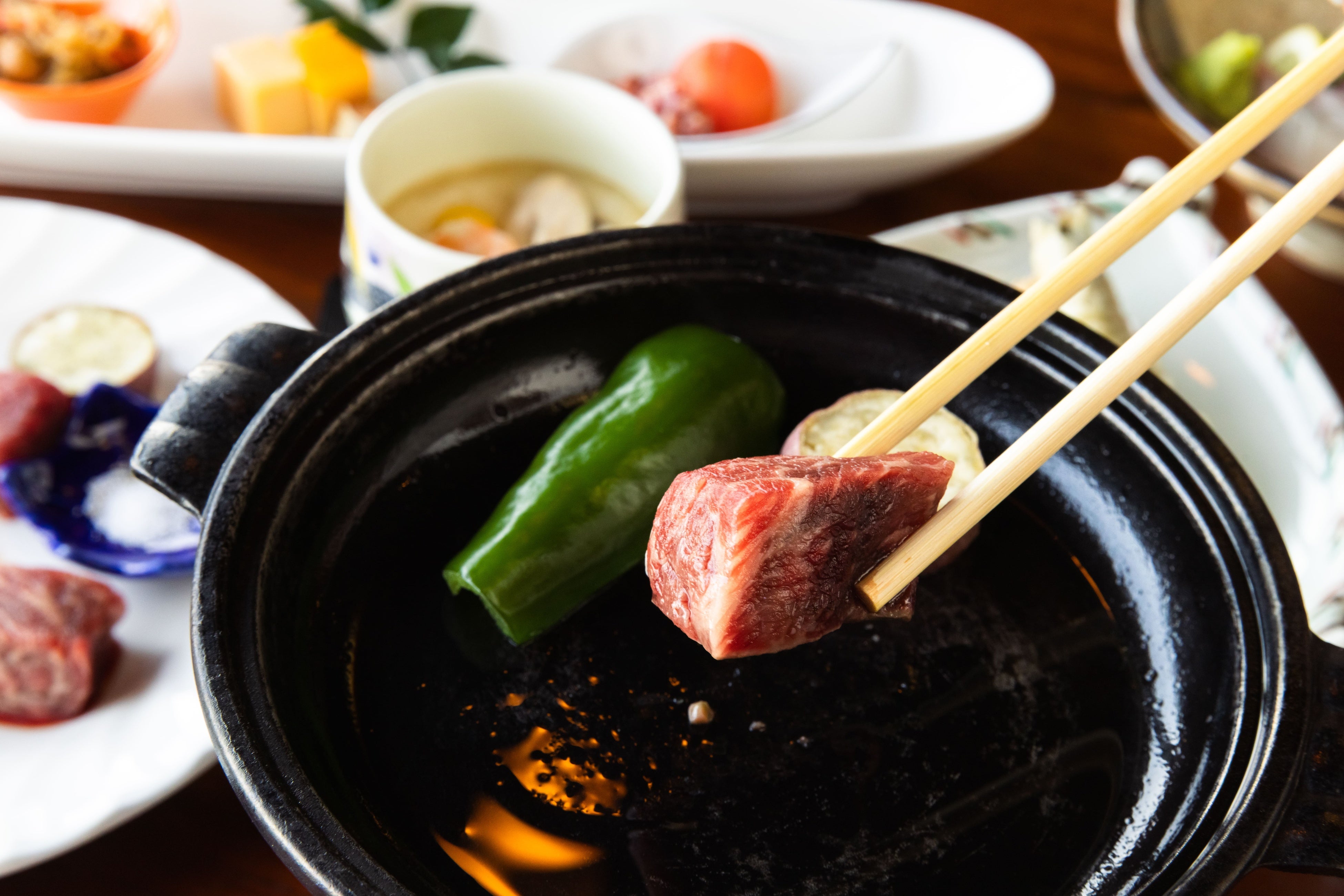 日南市で水揚げされたかつおをはじめとする旬のお造りに加え、宮崎県産ブランド牛「ひなた牛」をサイコロステーキでご用意。地元 日南市と宮崎の風土を映した、素材の持ち味を引き立てる会席料理に仕立てています。