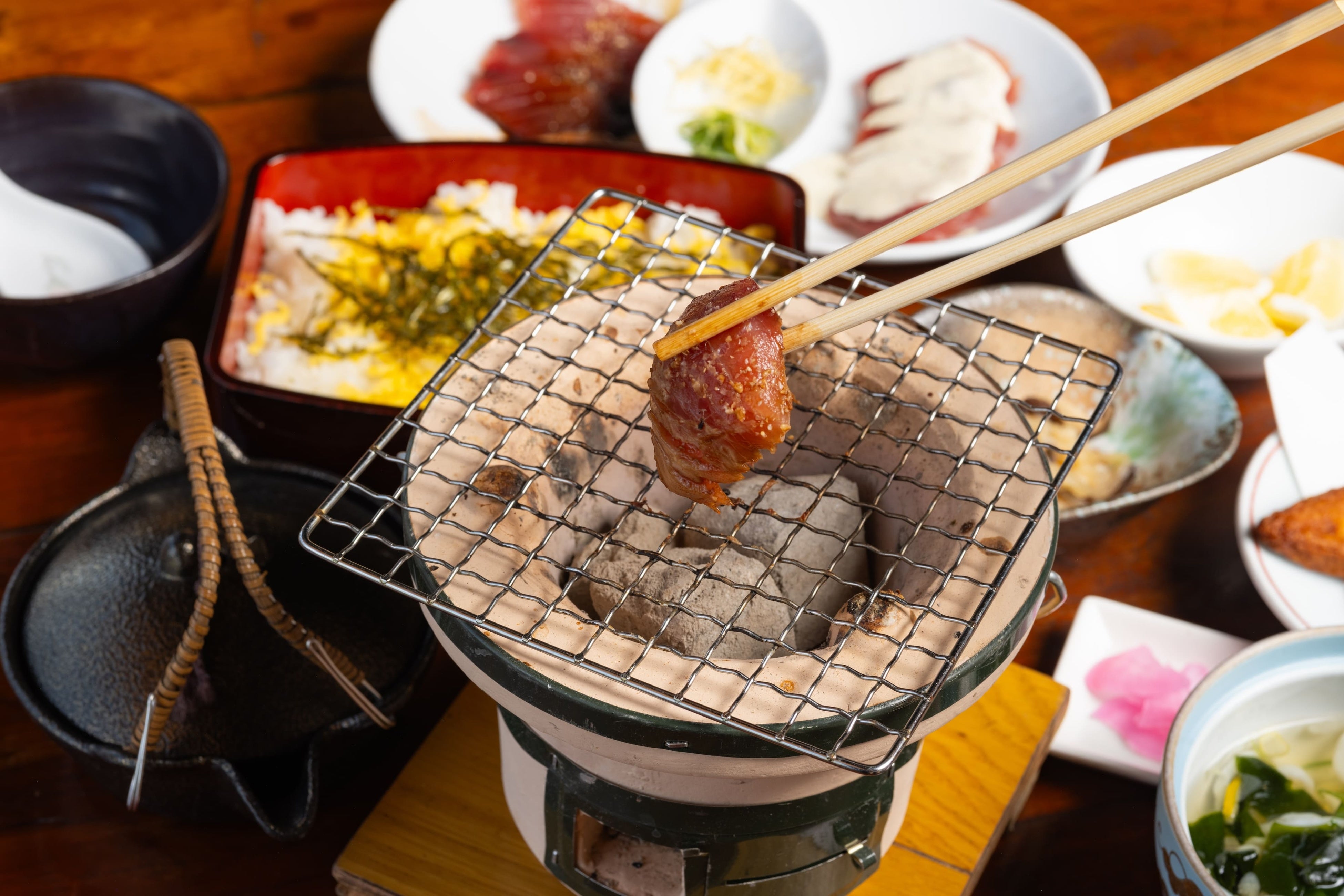 日南市発祥のご当地グルメである炙り重は、新鮮な漬けがつおを七輪で軽く炙り、重箱に盛り付けたご飯とともに味わう定食です。