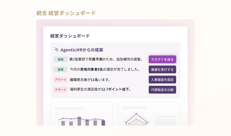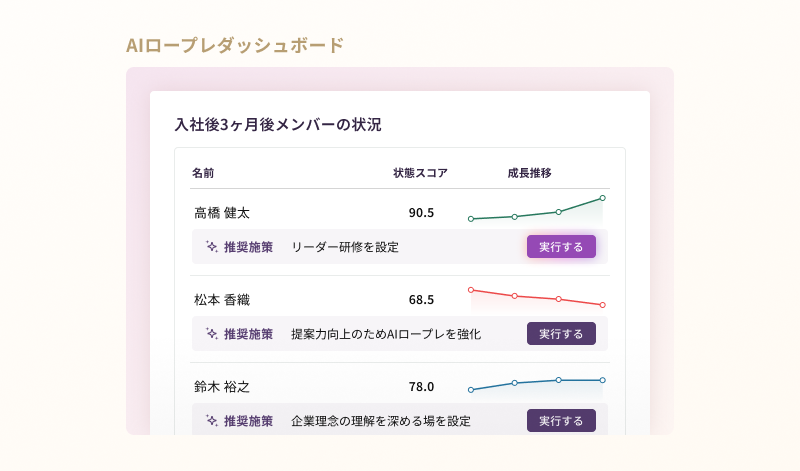 AI面接、AIロープレ、AI面談それぞれの情報を一覧化するだけでなく、AIエージェントが自動で情報分析し、次に取るべき経営判断を提案します。
