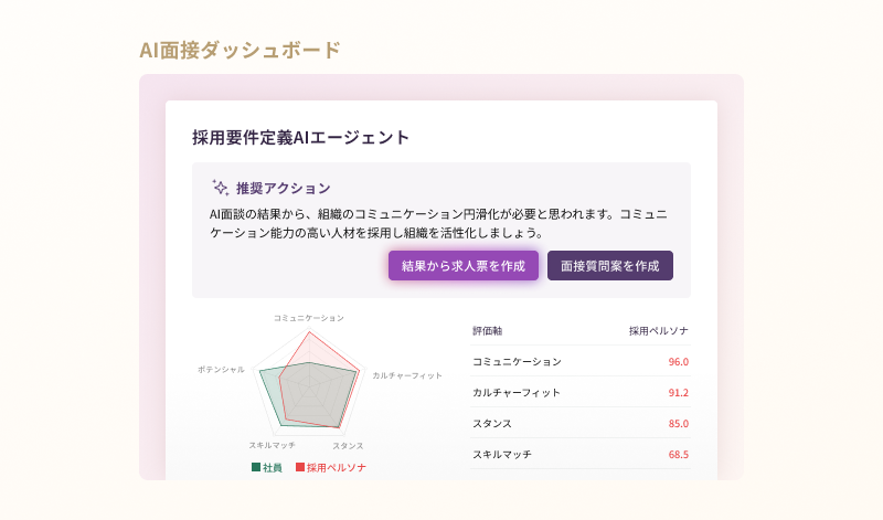 社内AI面談の結果から、今組織に必要な人材の採用要件を定義し、求人票まで自動で作成します。また、見極めに必要な面接質問や、想定回答集まで提案します。
