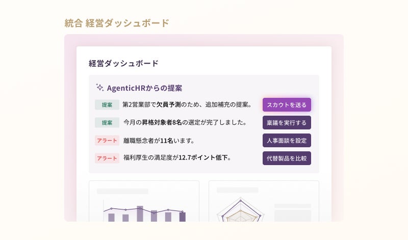 採用から活躍支援まで、AIで人事課題を解決する株式会社PeopleX(本社:東京都新宿区、代表取締役CEO:橘 大地、以下:当社)は、人事領域の重要課題を自律的に解決する新たな総合型AIエージェント基盤「PeopleX AgenticHR プラットフォーム」の提供を開始いたします。本製品は、従来型のSaaSとは一線を画し、AIが自律的に人事課題を特定し解決策の提案までを行う、新時代のAgenticHRプラットフォームです。対話型AIの活用により得られた様々なデータを一つの基盤で管理し、AI自らが高度な判断・提案を行うことで、組織の意思決定の速さと精度を格段に高めます。