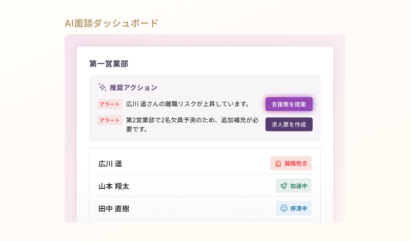 AI面談の結果から、個人の状態と組織全体の状態を可視化します。サポートが必要な人材に対してはアラートを出し、具体的な支援策まで提案します。