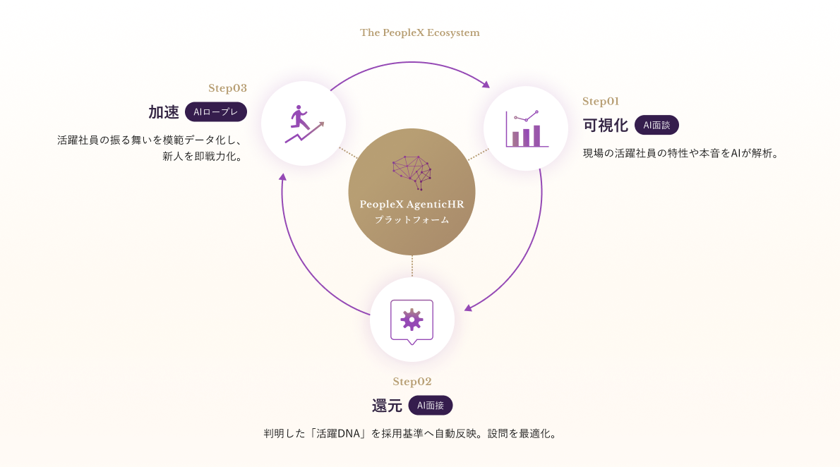 第一弾として、自社製品である「PeopleX AI⾯接」「PeopleX AI⾯談」及び「PeopleX AIロープレ」を相互連携することで、「組織と個⼈の特性」を「採⽤や育成」に最⼤限活⽤可能にするプラットフォーム環境の提供を開始いたします。