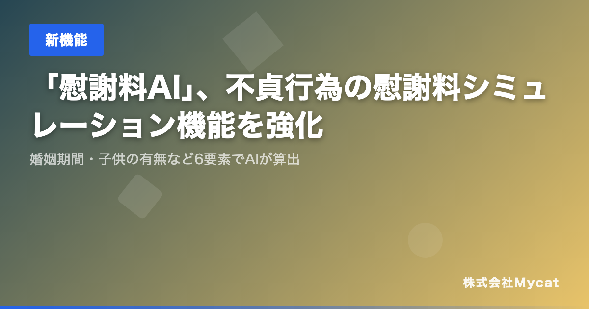 株式会社Mycat(本社:東京都目黒区)は、慰謝料シミュレーションサービス「慰謝料AI」(https://isharyo.xyz)において、不貞行為(浮気・不倫)に関する慰謝料シミュレーション機能を強化したことをお知らせいたします。