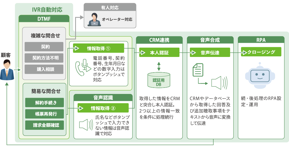 電話機のボタンの数字や記号で情報伝達を行う「DTMF*2機能」、氏名や住所などボタンプッシュでは入力できない情報を音声で取得する「音声認識機能」、取得した情報を顧客データベースと照合する「CRM連携機能」、入力内容や照合結果を顧客に音声で伝える「音声合成機能」の4つの機能を組み合わせて提供されます。さらに、証明書の発行やSMS発信など後続の作業が必要な場合は、「RPA*3機能」を組み込むことで、入電から後処理まで一貫した自動対応を実現します。