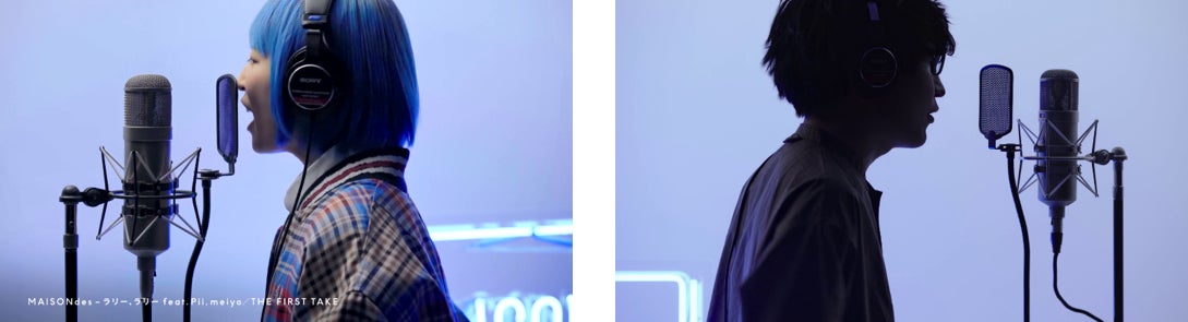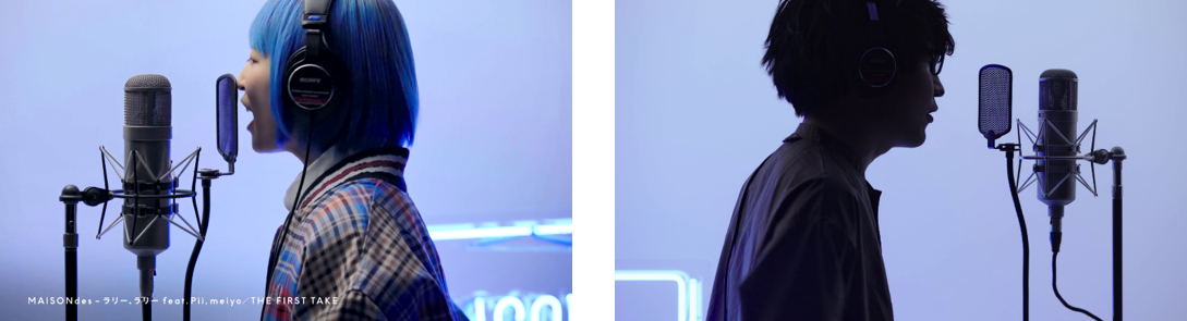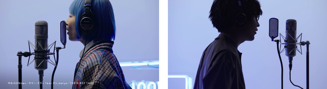 若者たちと交互に映し出されるのは、「MAISONdes」にフィーチャリングされたPiiさんとmeiyoさんの姿。二人は、「THE FIRST TAKE」での一発撮りに挑むべく、白い壁を背にしてマイクに向き合います。