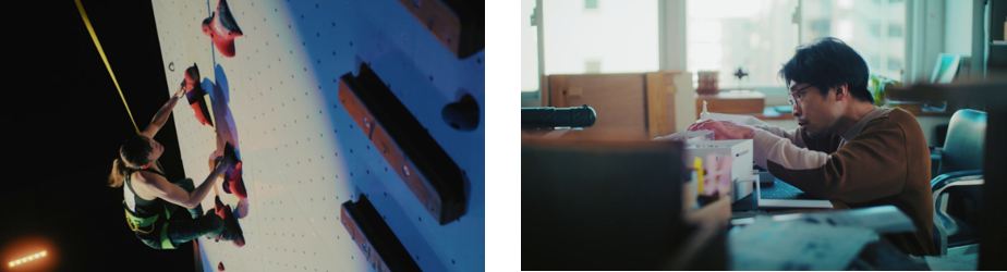 これから大きな挑戦を控える三人の若者…ロッククライミングの大会に参加するアスリート、大きなコンペティションに向けて準備を進める建築家、大きなプレゼンを控えた会社員。“一度きり”の人生のための新しい挑戦を前にして、三人の表情には緊張感がただよっています。