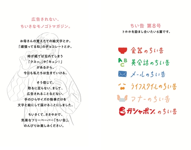 いますが、「ちい告」は、そんな「ZINE」の特徴を取り入れています。広告コピーライターとアートディレクターの「言葉」と「絵」を、広告ではない自由なカタチで、多くの人にお届けするためのツールです。
