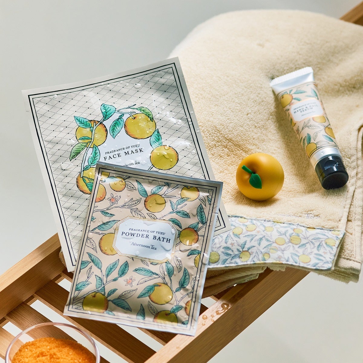 また、「ゆず」「いちじく」のアイテムの一部には、剪定され通常廃棄されるオリーブの葉を有効活用(保湿成分:オリーブ葉エキス)したケアアイテムや、生産工程で植物由来のバイオマス糸を活用したタオル等、環境に配慮したアイテムも揃いました。くわしくはこちらから:https://shop.afternoon-tea.net/shop/e/efeature-autumnfragrance/