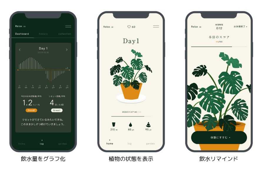 コースターによって記録された水分量は、アプリ上で参照することできます。また、飲んだ水分量やタイミングに応じて、植物の生育状況や周りの環境などが動的に変化します。