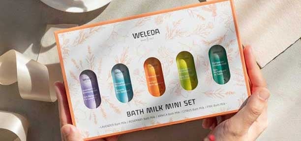 ヘッドスパメニューでも使用する、WELEDAで人気のバスミルク、ラベンダー、ローズマリー、アルニカ、シトラス、モミの5つの香りがセットになった「バスミルク ミニセット」 (各20ml×5/2970円)付きのプラン。ご自宅でもその日の気分に合わせて香りを楽しんでみて。 ※バスミルク ミニセットが数量に達し次第、プラン販売を終了します