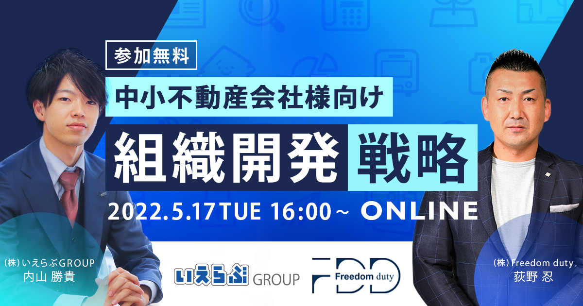 株式会社いえらぶGROUP(本社:東京都新宿区、代表:岩名泰介、以下いえらぶ)は、不動産売買仲介・建築(注文、リノベーション)会社に向けた無料オンラインセミナーを2022年5月17日(火)に開催します。特別ゲスト講師に株式会社Freedomduty(本社:東京都渋谷区、以下Freedomduty)の代表取締役である荻野忍氏を迎え、「最適な人材育成や組織開発による中規模組織における組織力の向上」についてお話しいただきます。実績に基づく営業マンの有効的な育成についてのノウハウを無料で聞くことができる貴重な機会です。