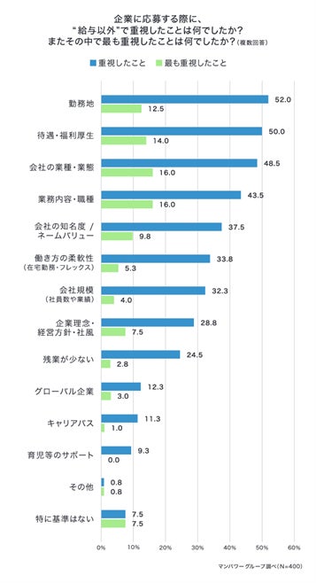 企業に応募する際に"給与以外"で重視した点トップ3:「勤務地」「待遇・福利厚生」「会社の業種・業態」