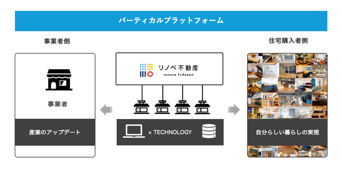 「中古仲介+リノベーション」のワンストップサービス市場シェアNo.1*の「リノベ不動産」の運営、また業界特化型マーケティングオートメーションの開発など、IT×リアルを融合した中古住宅プラットフォーム事業を推進しています。