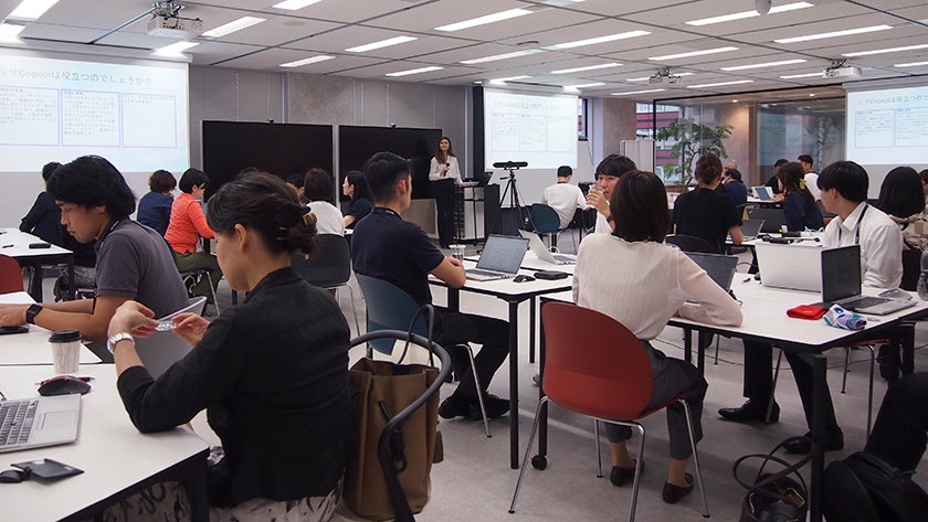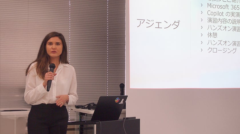 今回のイベントには、Microsoft社のスイス拠点から、クラウドソリューションアーキテクストのAlina Mititelu氏が来日し、Copilotを効果的に活用するためのプログラムとして約2時間レクチャーを行いました。会場となった田町本社とオンライン配信のハイブリッド形式で開催され、約120名がイベントに参加しました。