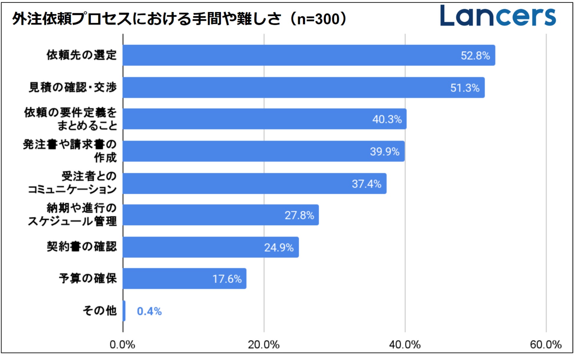 ランサーズは、外注依頼の経験がある社会人300名を対象に「外注依頼プロセスにおける手間や難しさ」について調査を実施しました(※1)。その結果、「依頼先の選定」や「見積もりの確認・交渉」に手間や難しさを感じる人が半数以上おり、次いで「依頼内容の要件定義をまとめること」が課題として挙げられました。