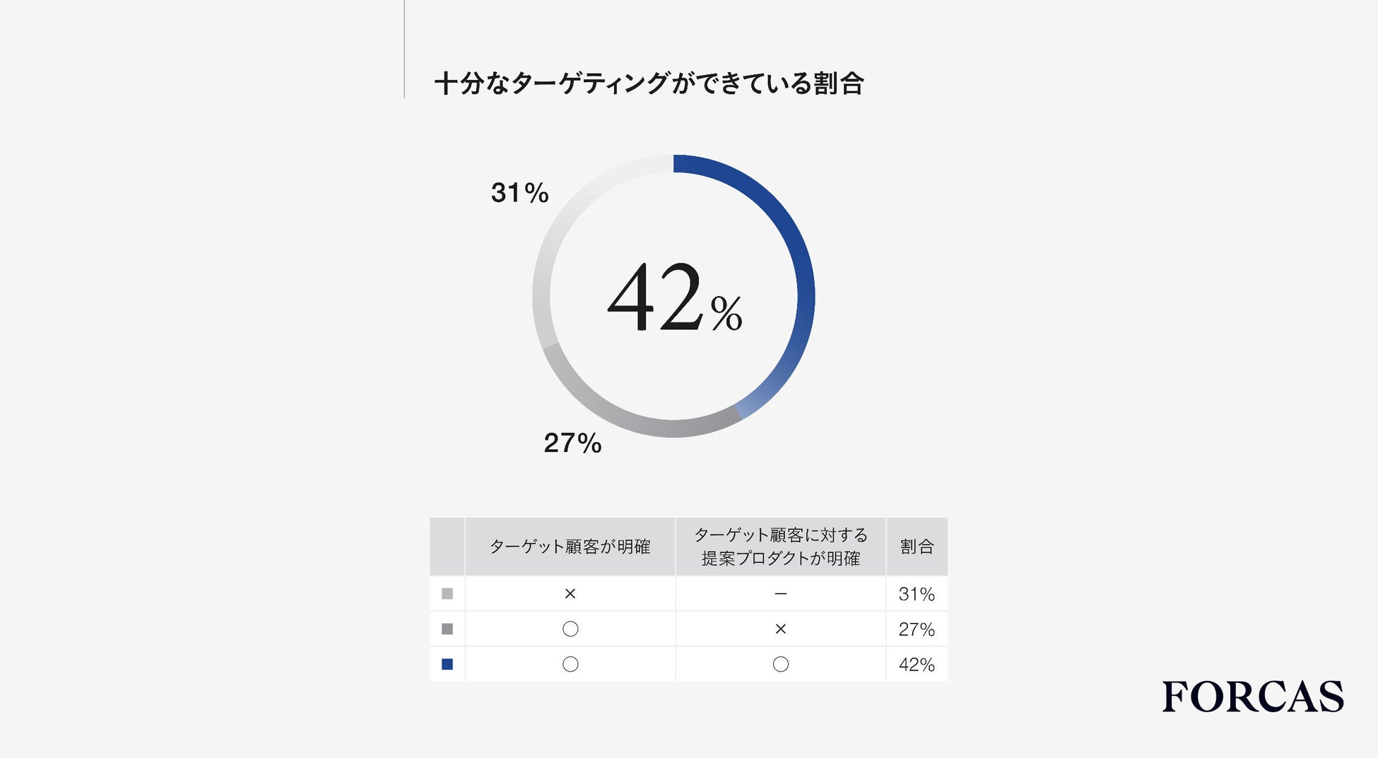 回答者のうち、「ターゲット顧客(優先的に売上を拡大する顧客)」が明確であり、かつ「ターゲット顧客に対する提案プロダクト(どの商材・サービスを提案すべきか)」も明確になっているのは42%でした。「ターゲット顧客」が明確であるにもかかわらず、「提案プロダクト」が明確にできていないという層は27%存在します。