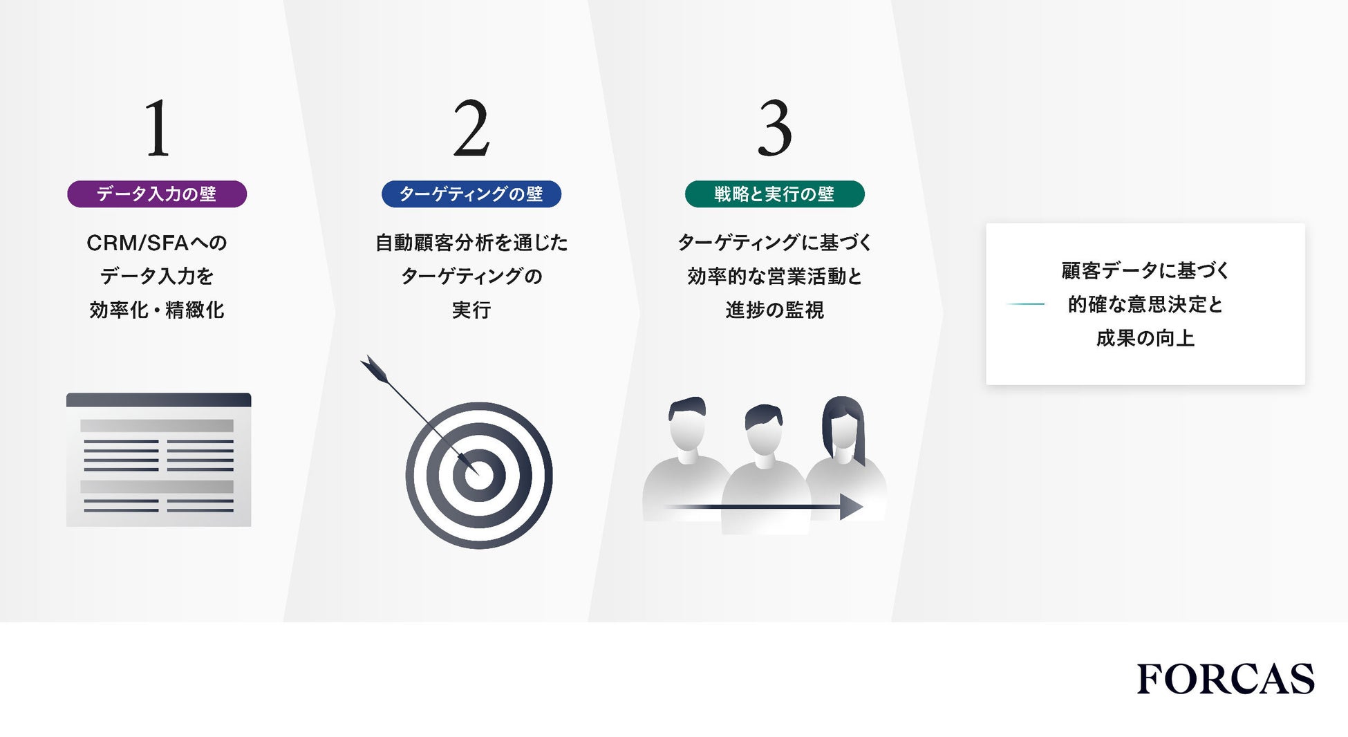 上記3つの壁を乗り越えることができている営業企画部門は、現状では一部に限られます。しかし、今後より多くの企業がこれらの壁を乗り越え、データ入力→ターゲティング→戦略から実行への落とし込みをスムーズに行うことができれば、顧客データに基づく適切な意思決定を行い、営業DXによって売上・利益の向上を実現することができるのではないでしょうか。