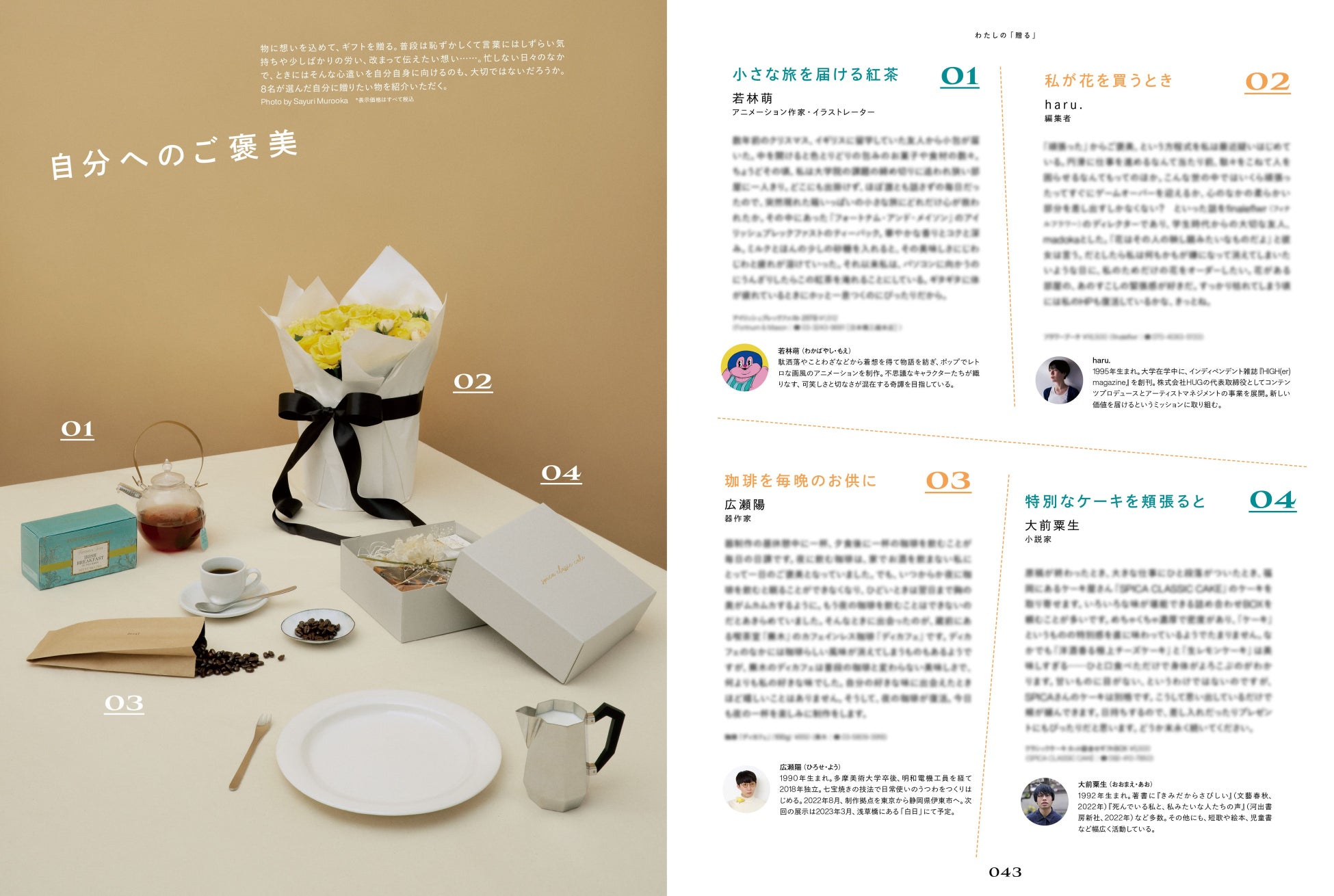 今号の特集テーマは「贈る」。クリスマス・お歳暮・帰省のシーズンにあわせて、さまざまな分野で活躍する35名の方々の“贈り物”にまつわる極私的なエピソードが綴られるギフトカタログ企画をはじめ、贈り物を介したコミュニケーション、贈答文化から読みとく精神性など、「贈る」という行為が持つ魅力や可能性を探っていきます。