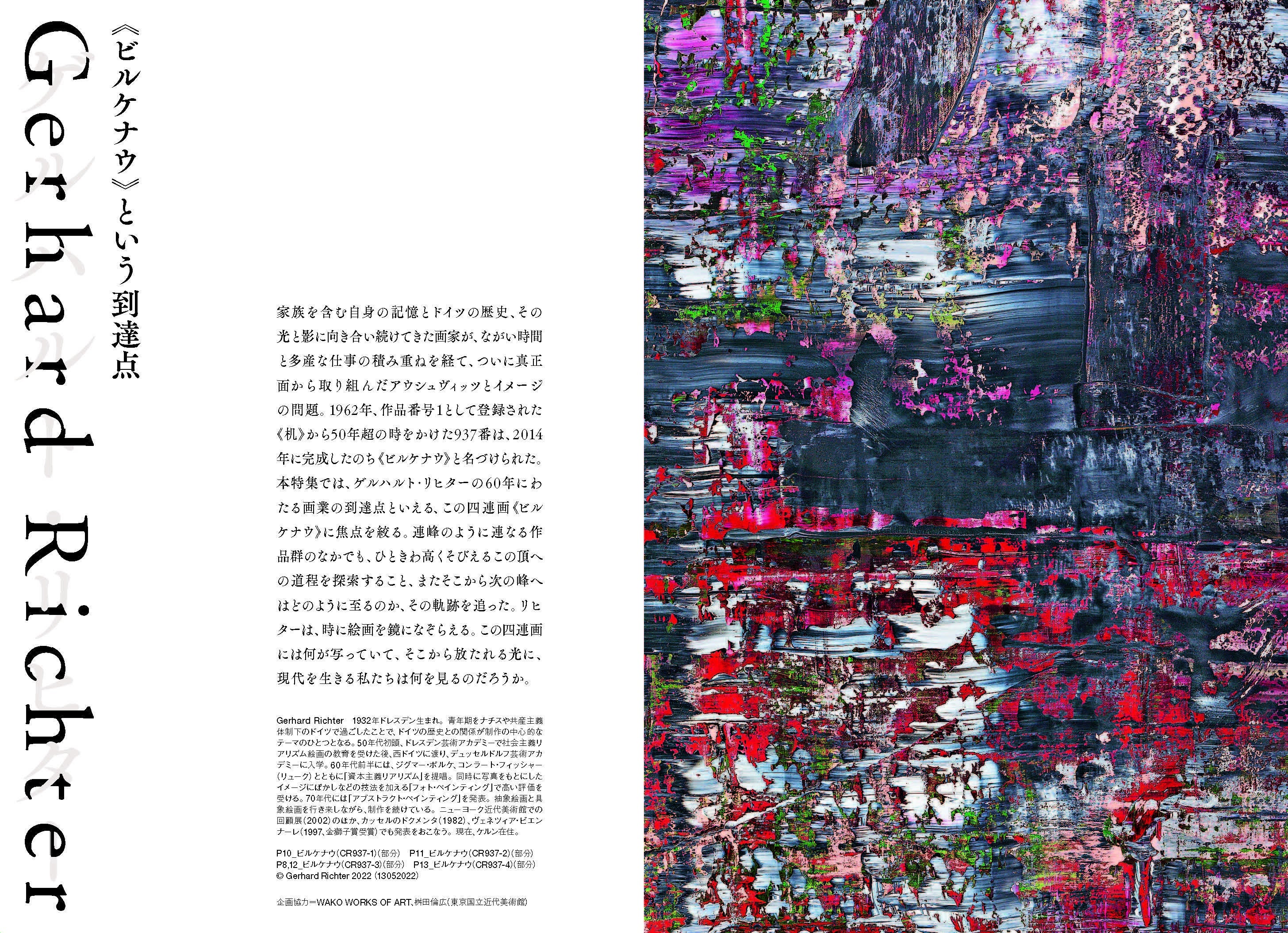 今年、日本で16年ぶり東京では初となる美術館での個展開催が決まっており、注目が高まっているリヒター。(東京国立近代美術館[6月7日〜10月2日]、豊田市美術館[10月15日〜2023年1月29日])。本特集では、60年にわたる画家としての活動と多くの制作の先、その画業の到達点といえる大作《ビルケナウ》(2014)に焦点を当てる。