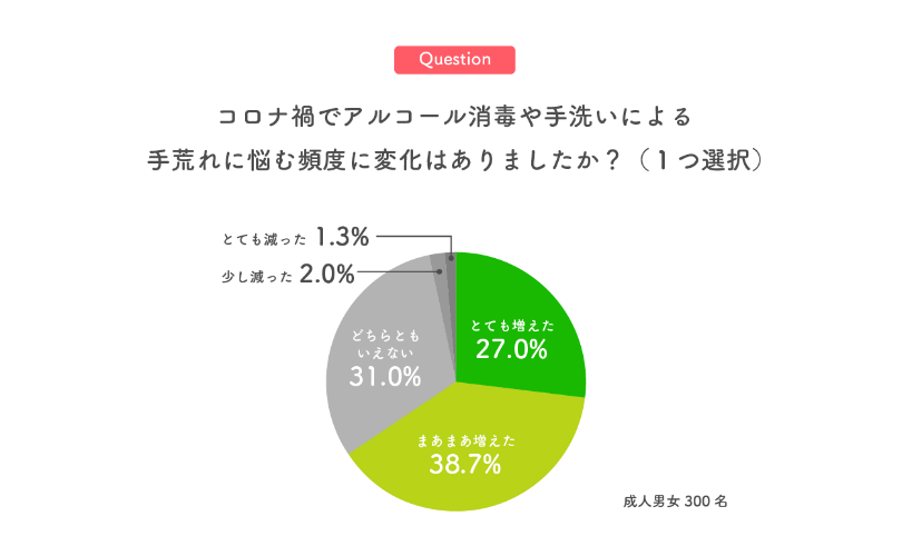 《コロナ禍でアルコール消毒や手洗いによる手荒れが増えた人は約7割》